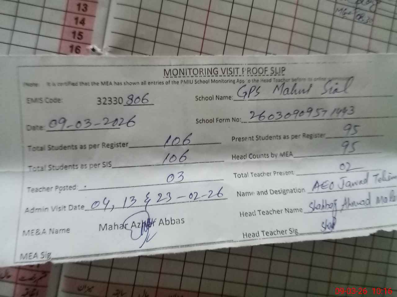 | Attendance Register | Head Teacher | MEA with School | Visit Proof |