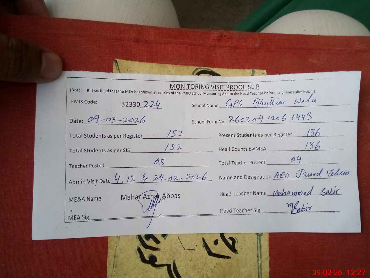 | Attendance Register | Head Teacher | MEA with School | Visit Proof |