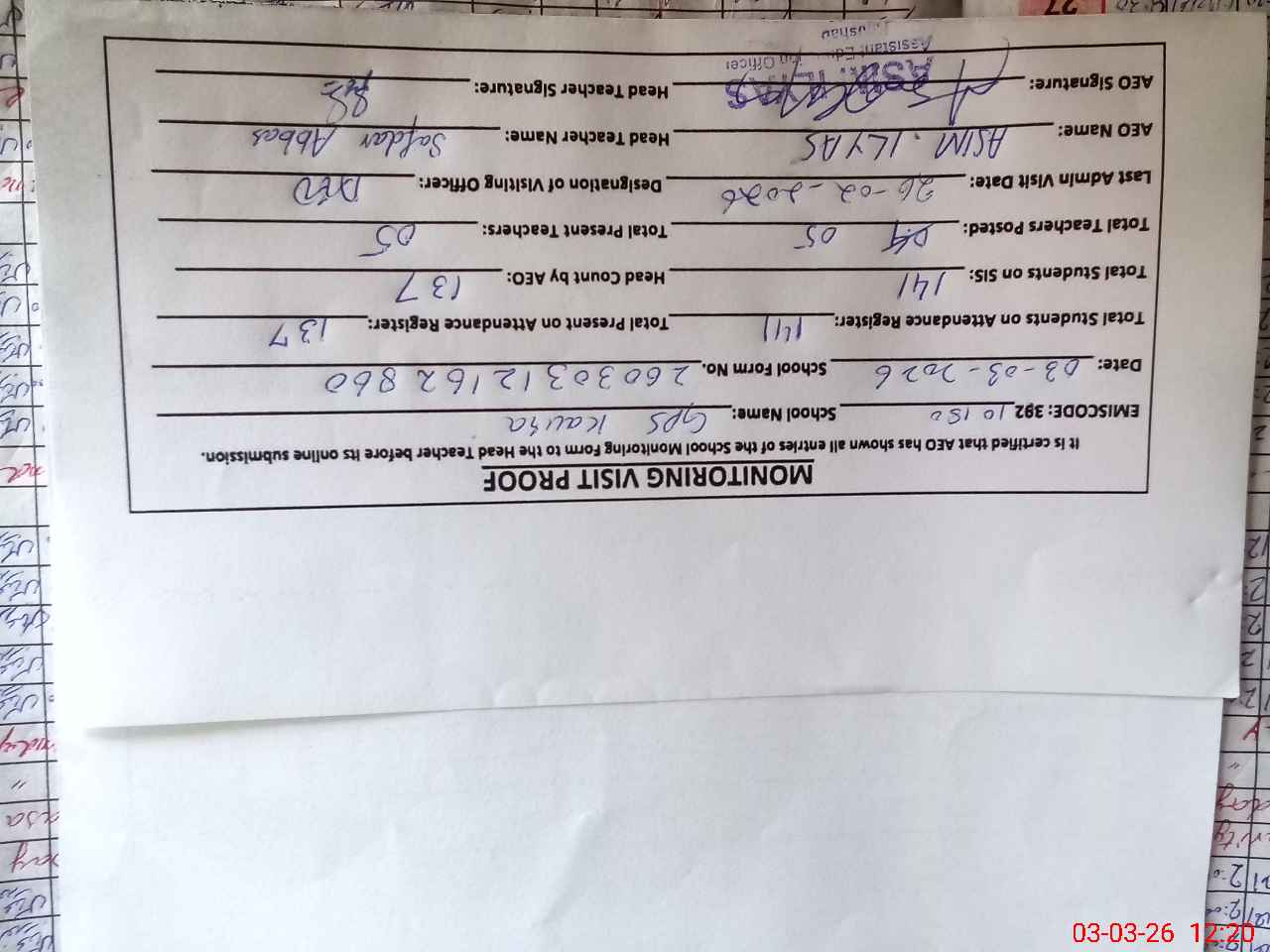 | Attendance Register | Head Teacher | MEA with School | Visit Proof |