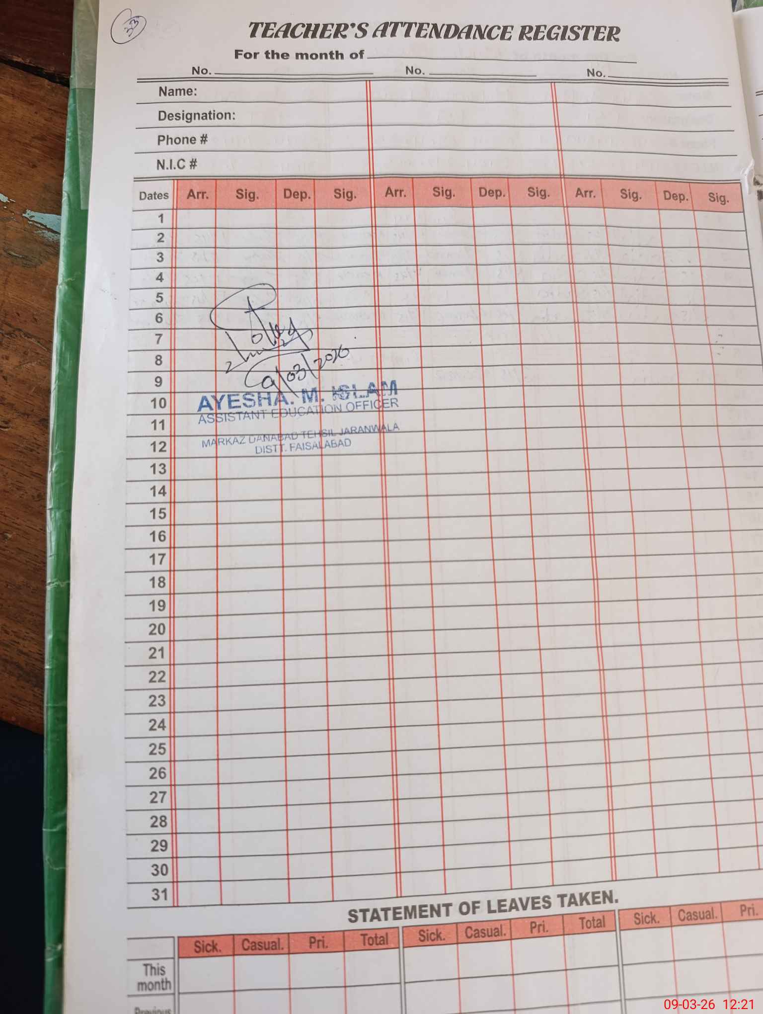 | CNIC | Full Name | Designation | R/C | Absence During Last Calender Month |