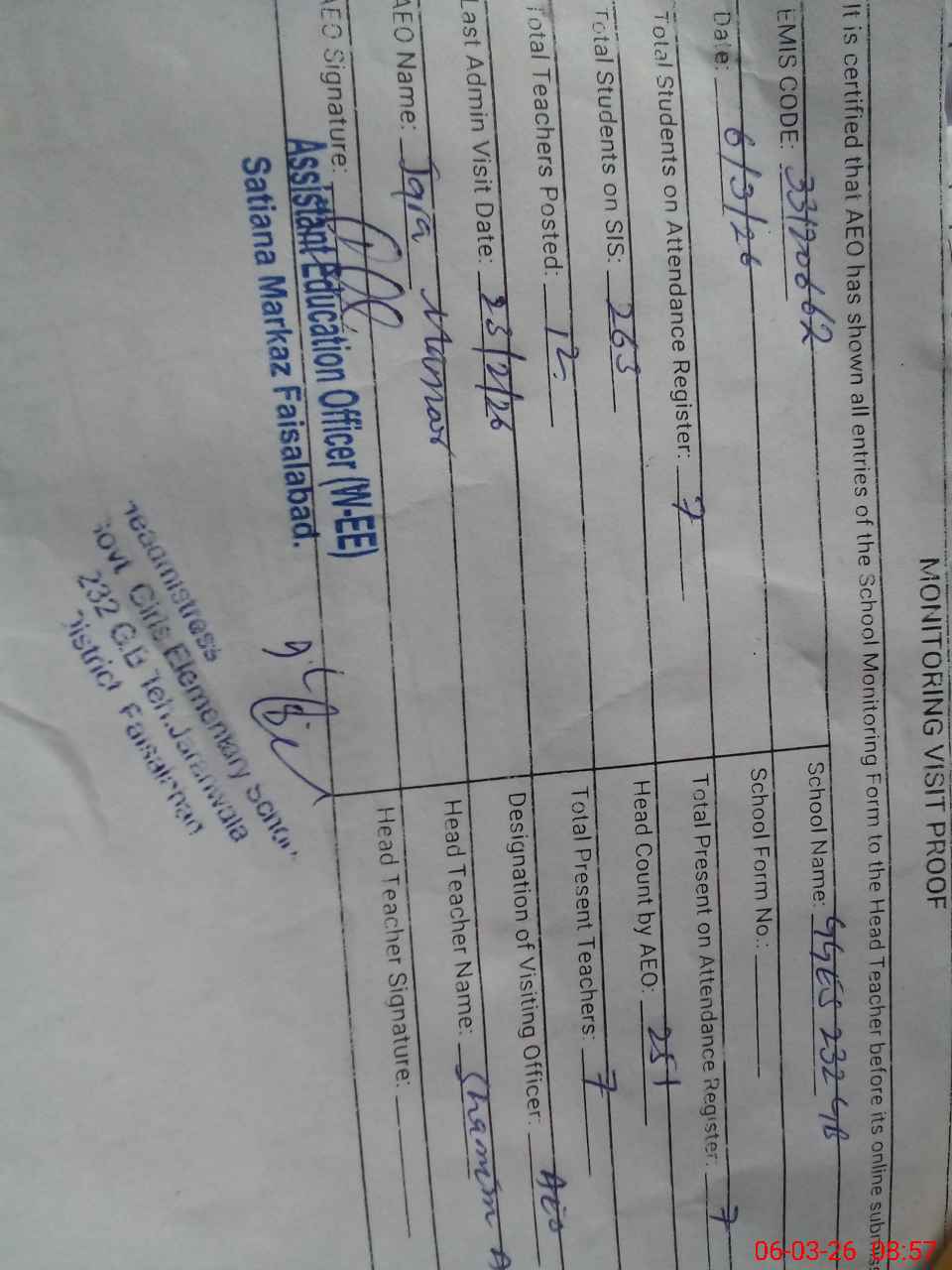| EMIS Code: 33120662 | Name of School: GGES CHAK 232 GB SATIANA | |||