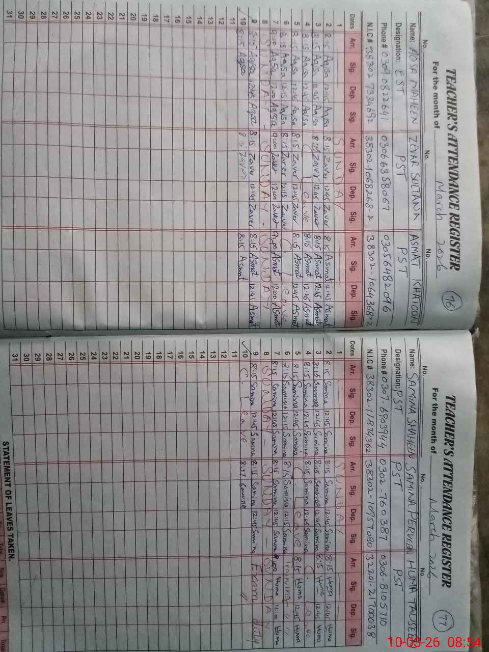 | CNIC | Full Name | Designation | R/C | Absence During Last Calender Month |