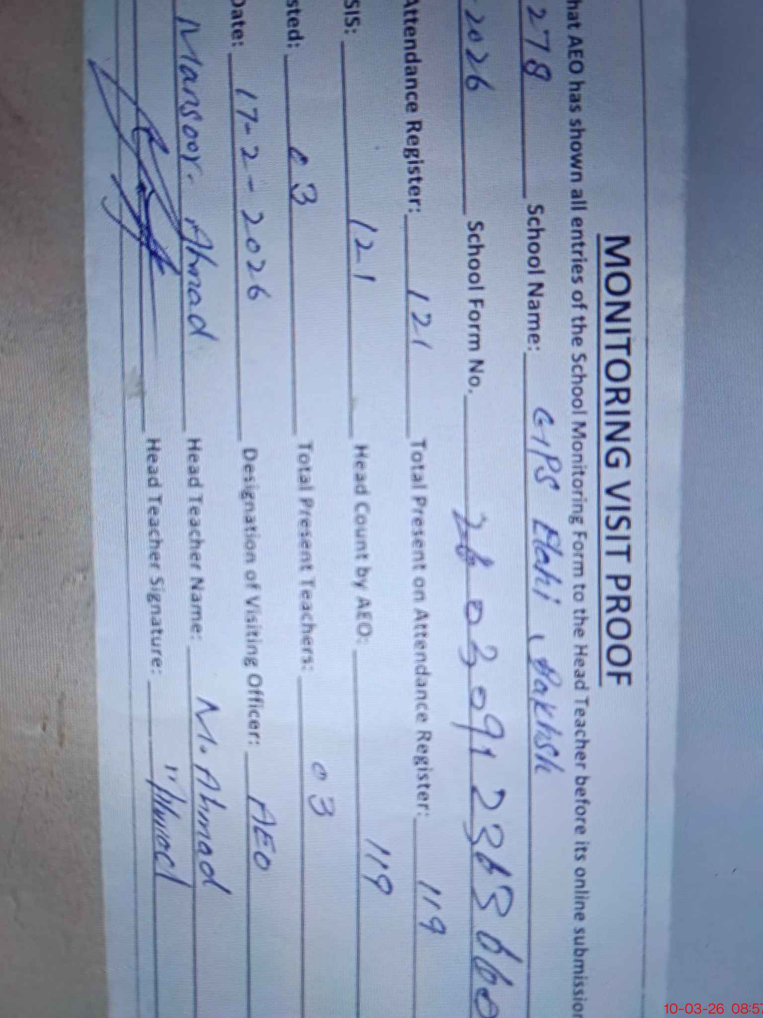 | Attendance Register | Head Teacher | MEA with School | Visit Proof |