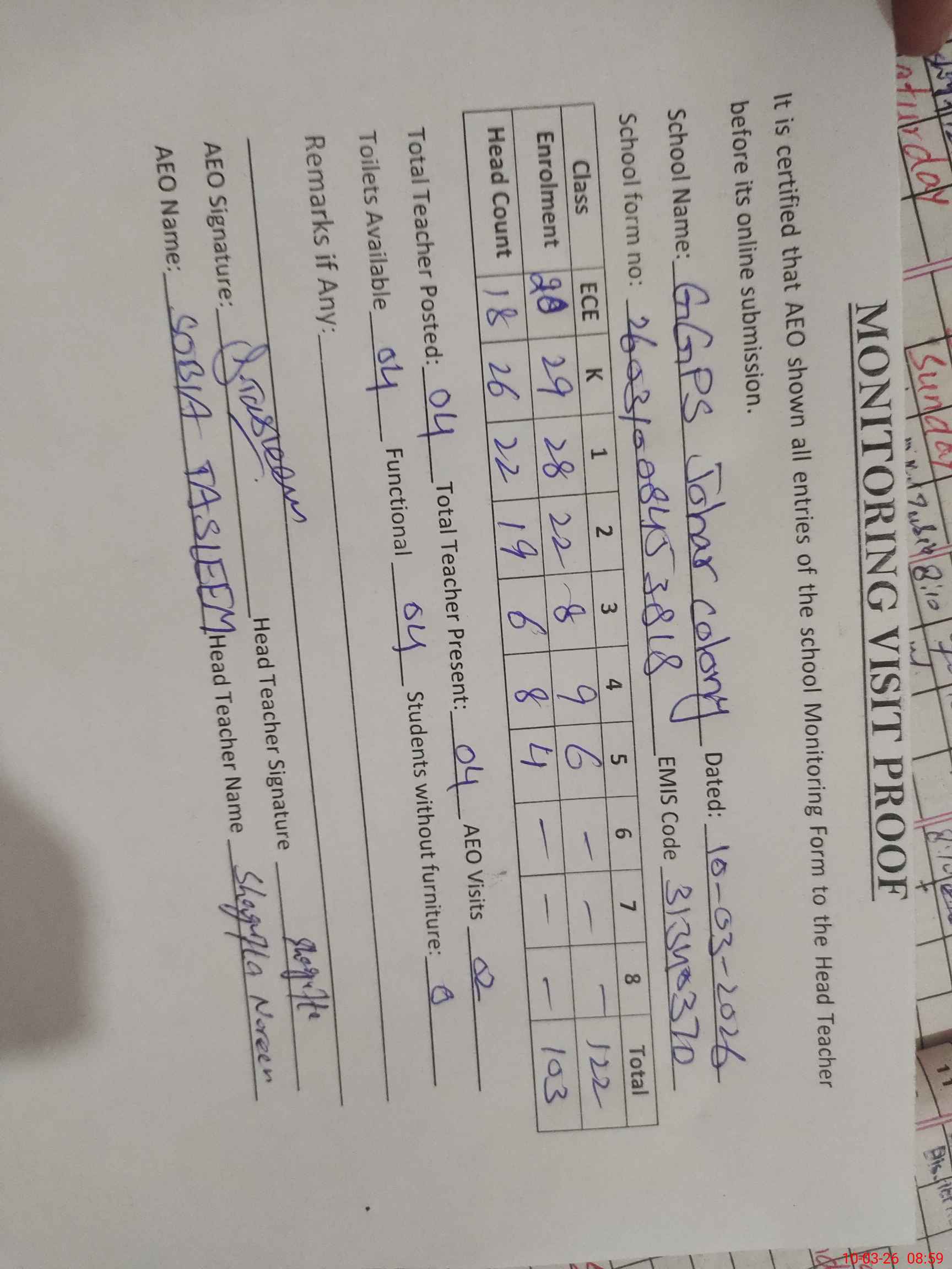 | Attendance Register | Head Teacher | MEA with School | Visit Proof |