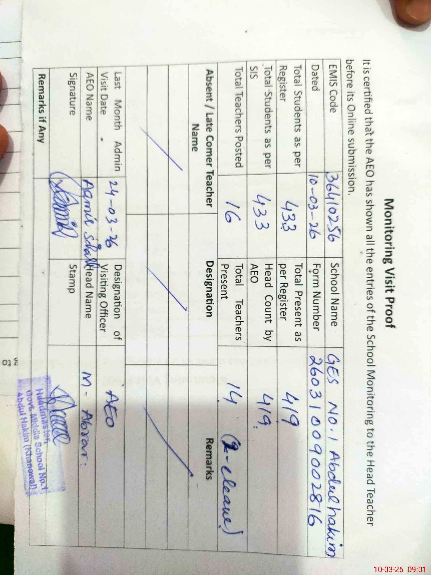 | Certified that this School was Inspected by the Undersigned MEA/DMO Today and the Information Stated Above is as Per Record. | |||||