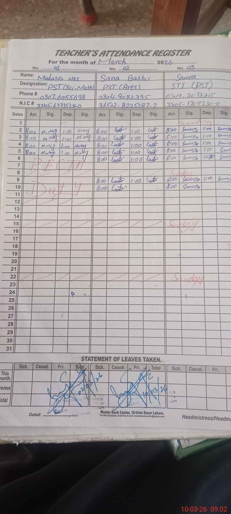 | 33**** | Mu**** Na**** | PST Science/Maths | Regular | 0 | 0 | 0 | 0 | 0 | 0 | 0 | 0 | 0 | Exam Duty |