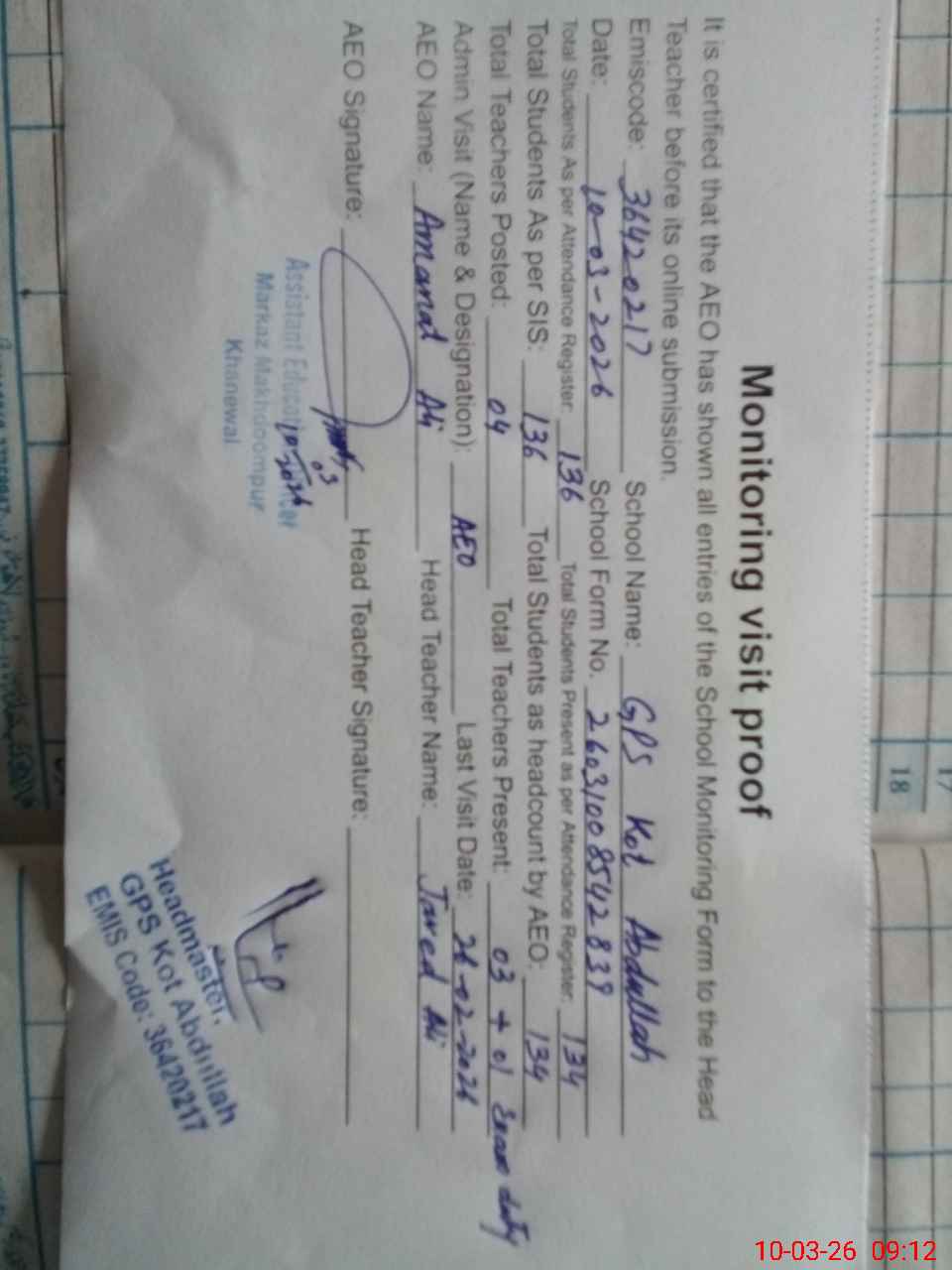 | EMIS Code: 36420217 | Name of School: GPS KOT ABDULLAH, P/O MAKHDOOM PUR, KHANEWAL | |||