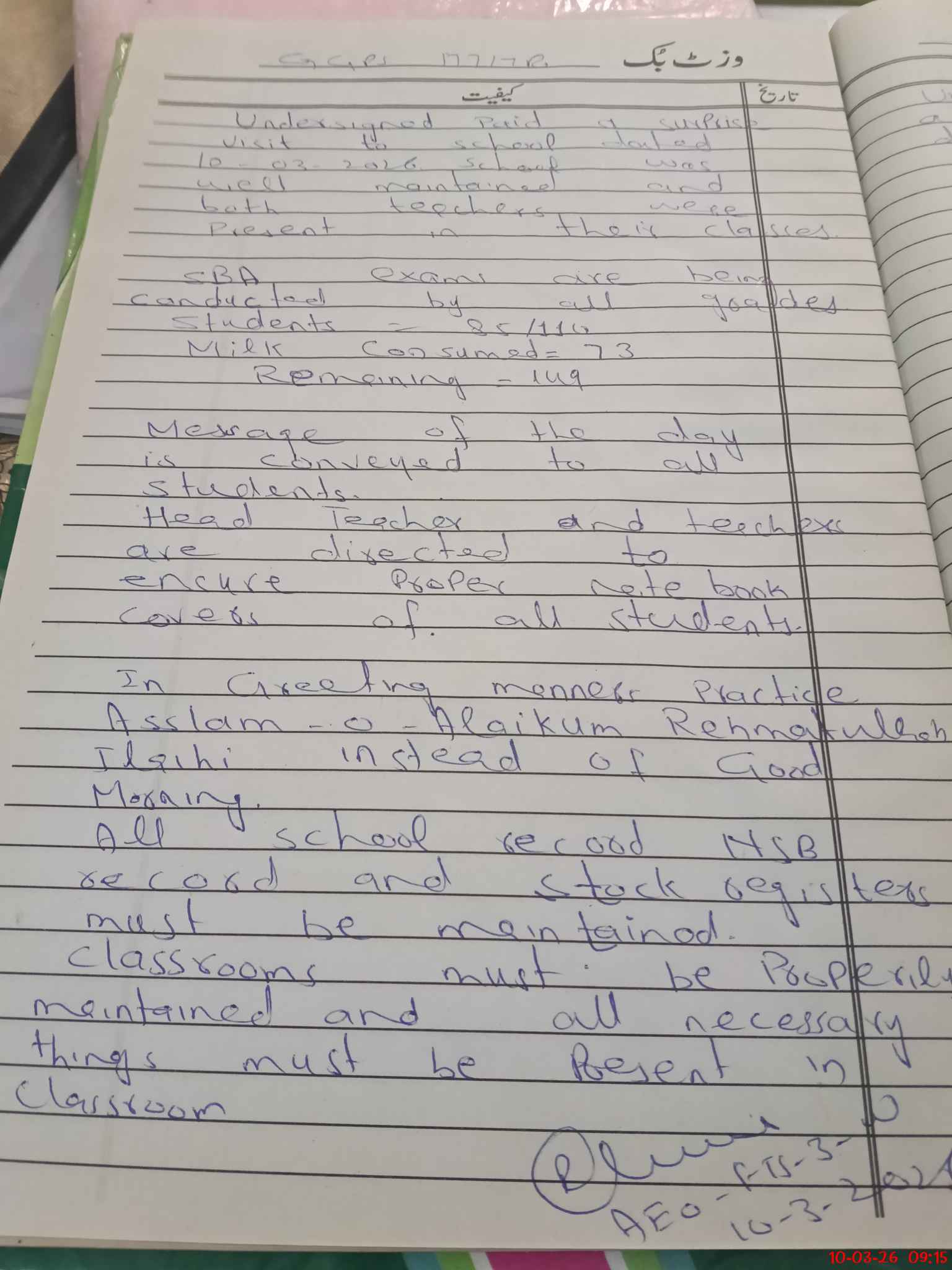 | Certified that this School was Inspected by the Undersigned MEA/DMO Today and the Information Stated Above is as Per Record. | |||||