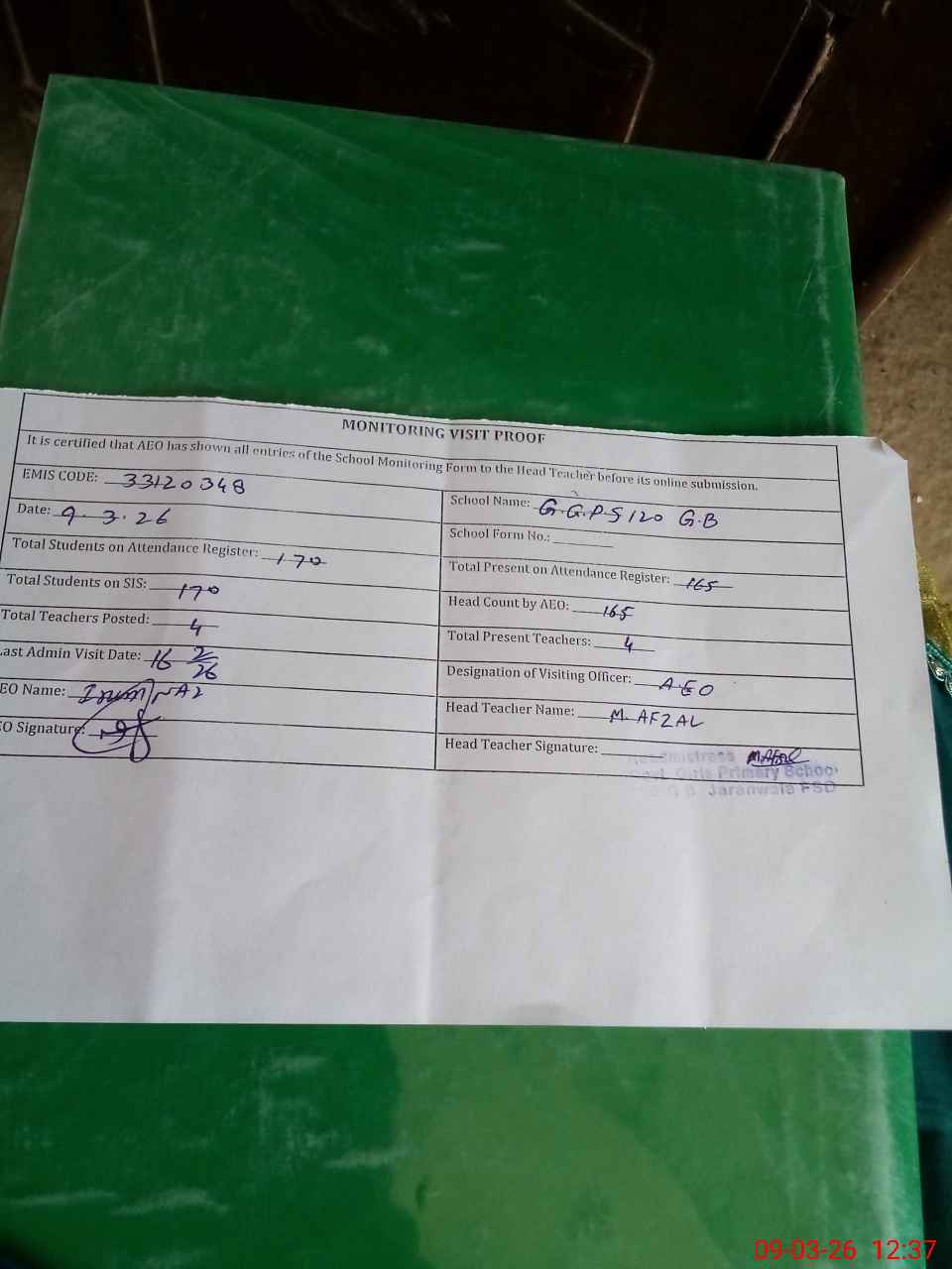 | Attendance Register | Head Teacher | MEA with School | Visit Proof |