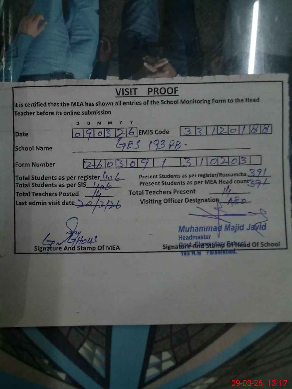 | Attendance Register | Head Teacher | MEA with School | Visit Proof |