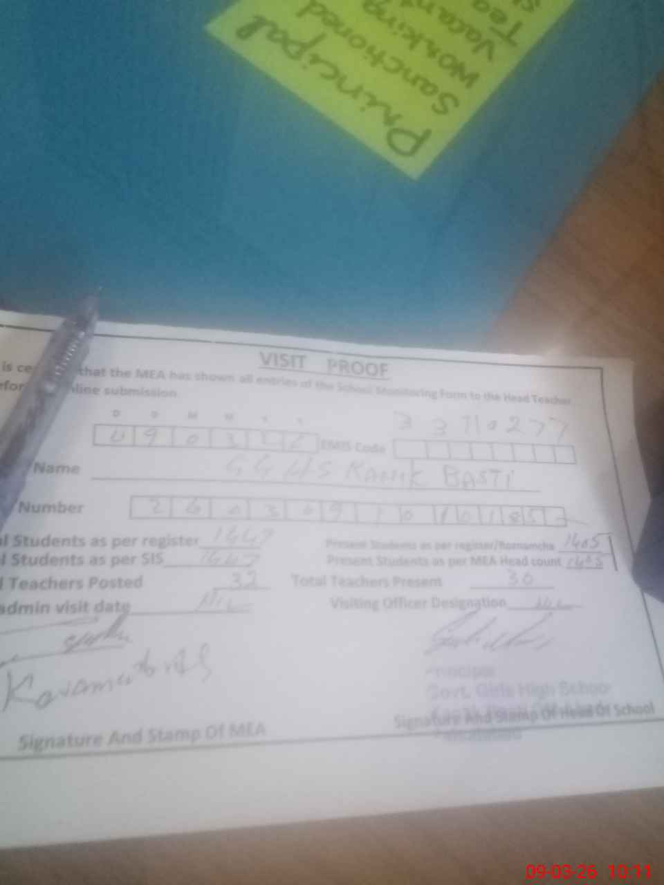 | Attendance Register | Head Teacher | MEA with School | Visit Proof |