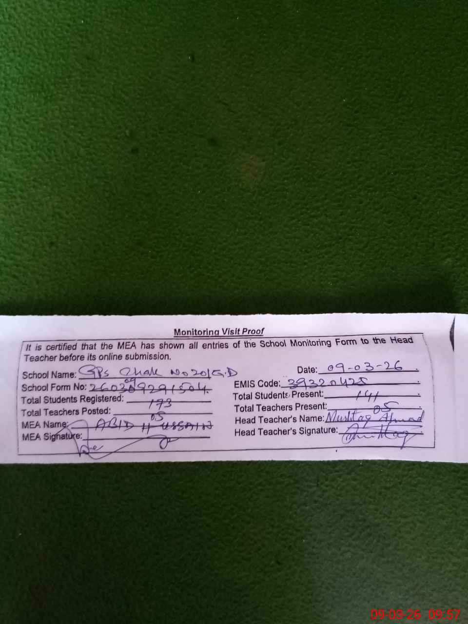 | EMIS Code: 39320425 | Name of School: GPS CHAK NO. 20/G.D | |||