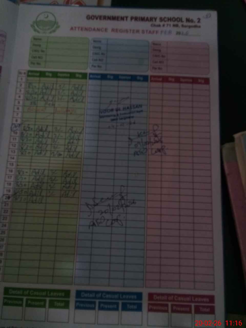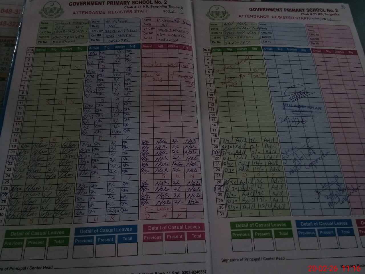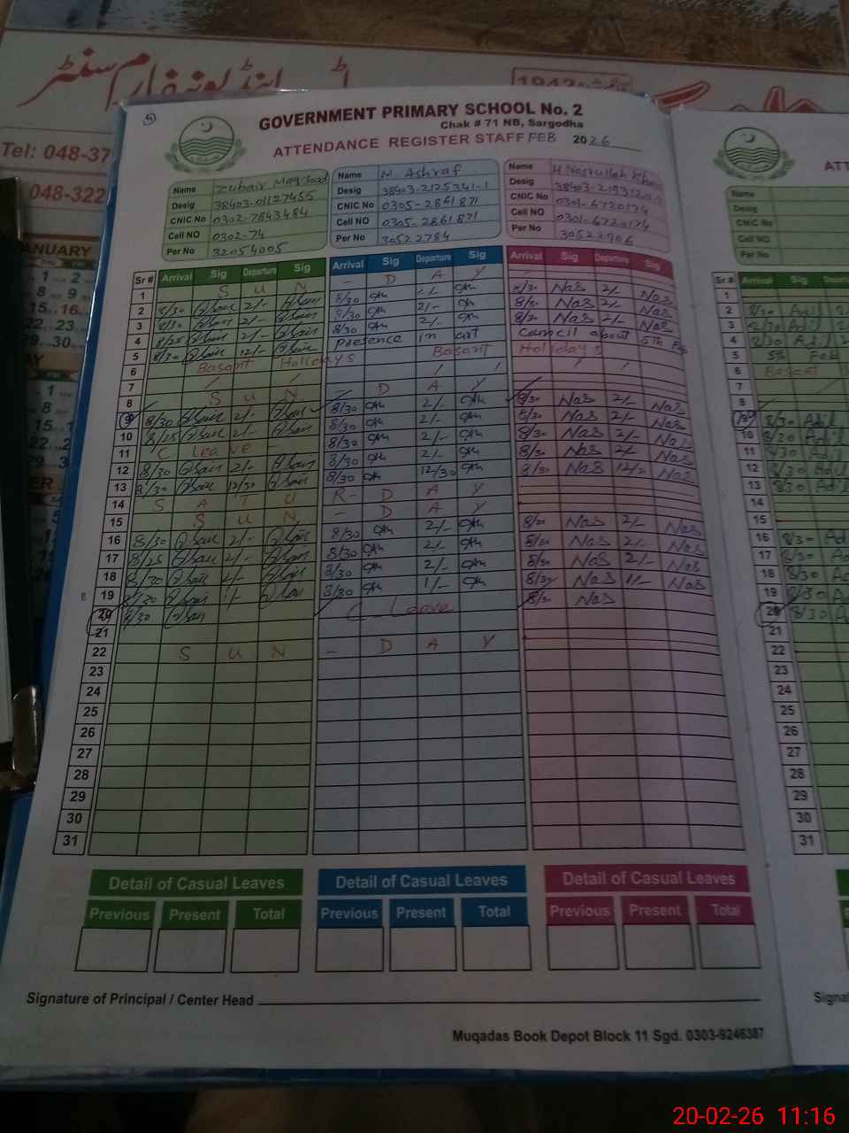 | CNIC | Full Name | Designation | R/C | Absence During Last Calender Month |