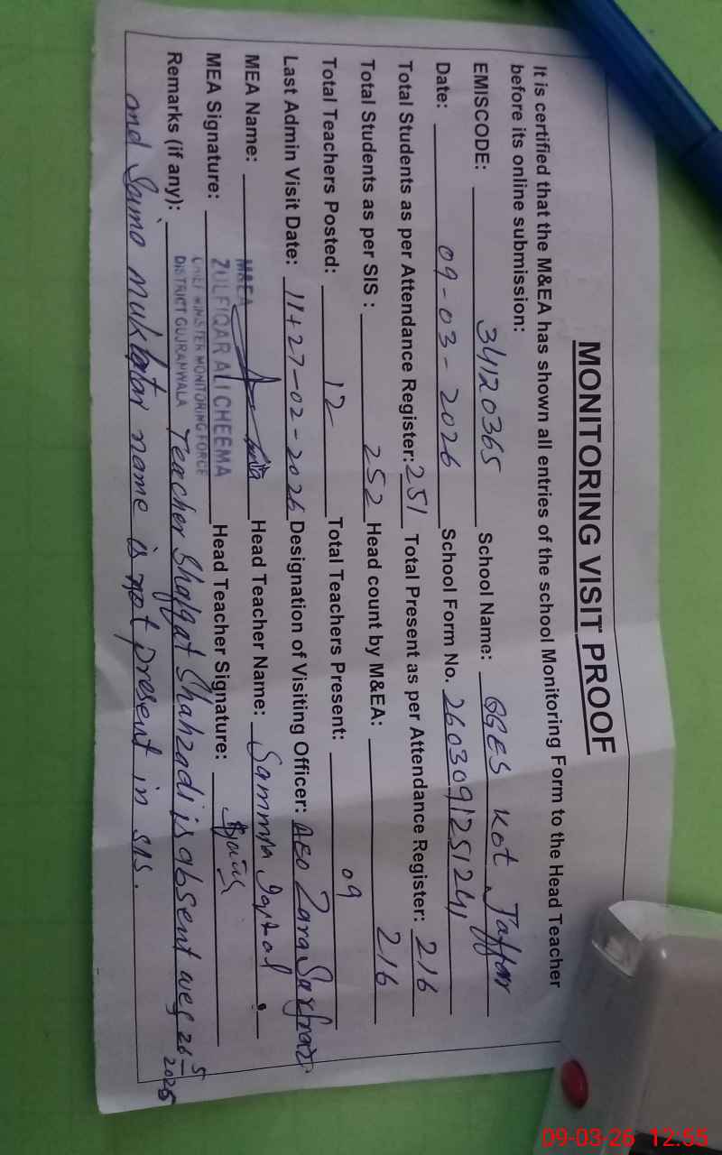 | EMIS Code: 34120365 | Name of School: GGES KOT JAFAR | |||