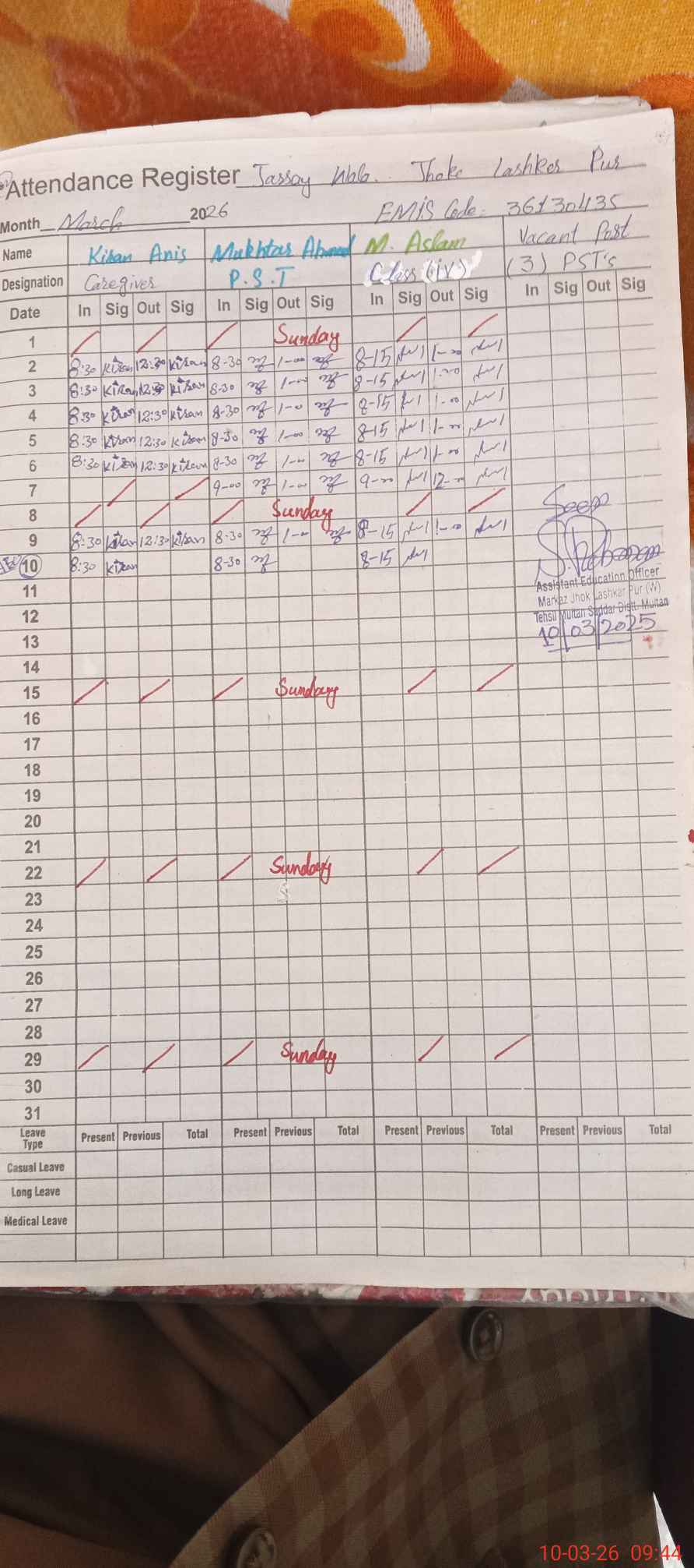 | 32**** | An**** Ba**** | PST Arts | Regular | 0 | 0 | 0 | 0 | 0 | 0 | 0 | 0 | 0 | Exam Duty |