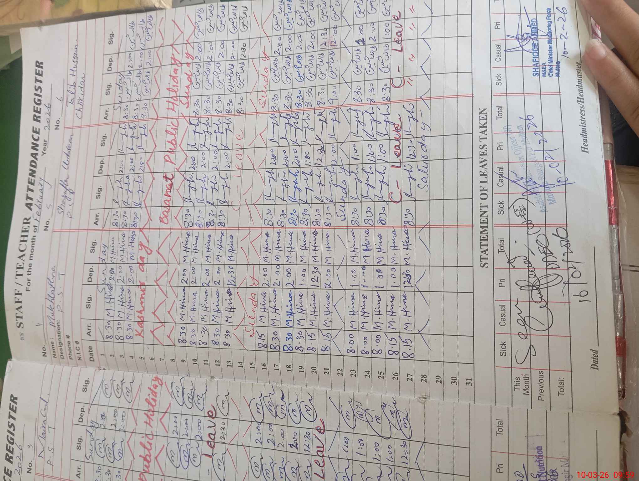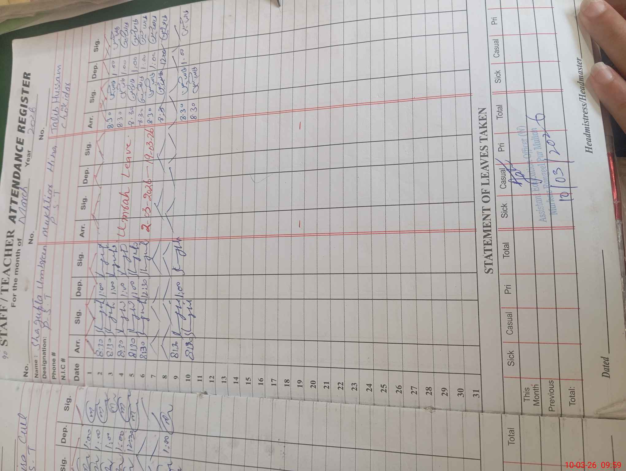 | Name: Sh**** Zu**** Designation: (School Headmaster's/Headmistress's) HEADMASTER Phone/Cell Number: 03**** |