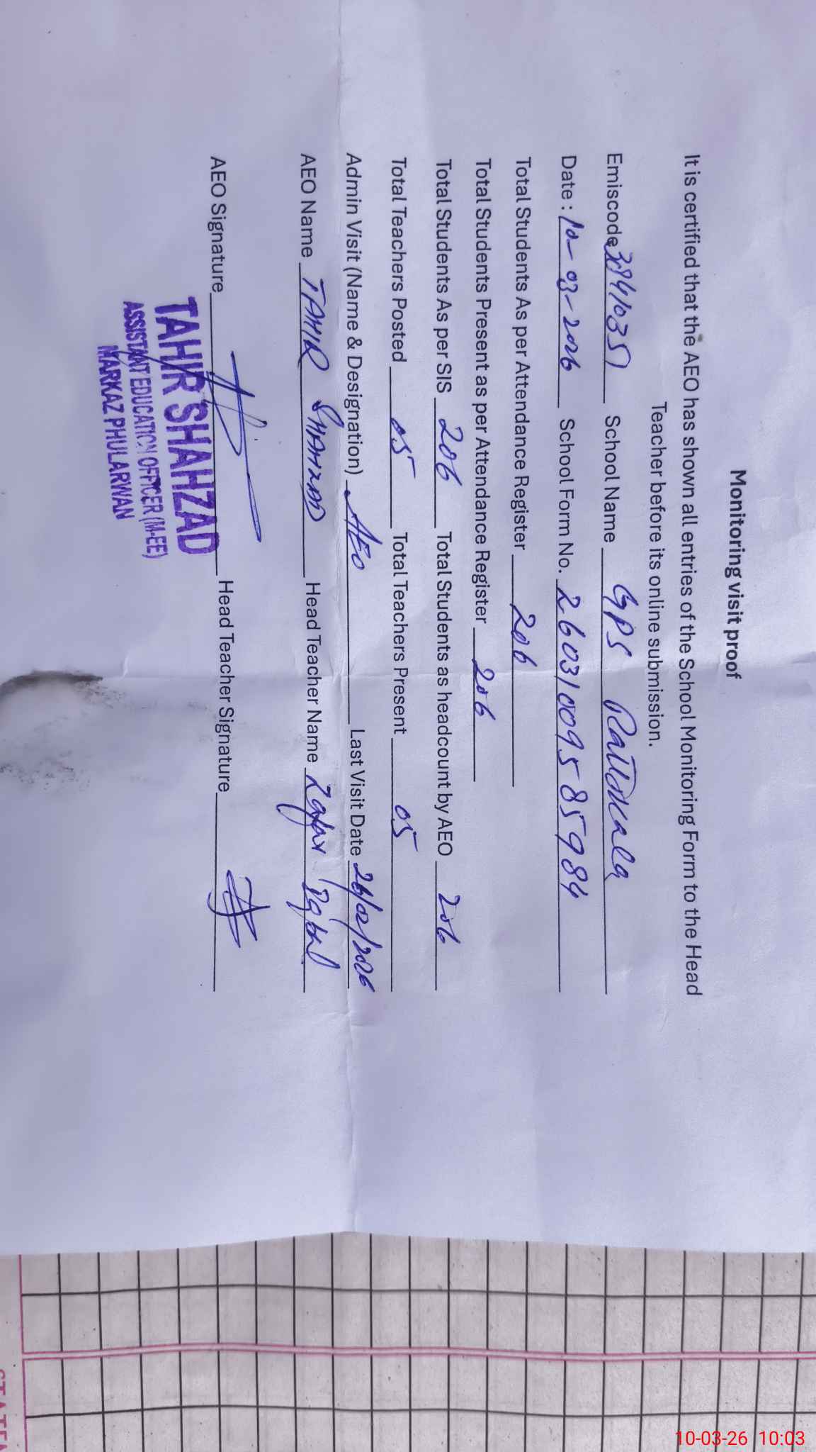 | Attendance Register | Head Teacher | MEA with School | Visit Proof |