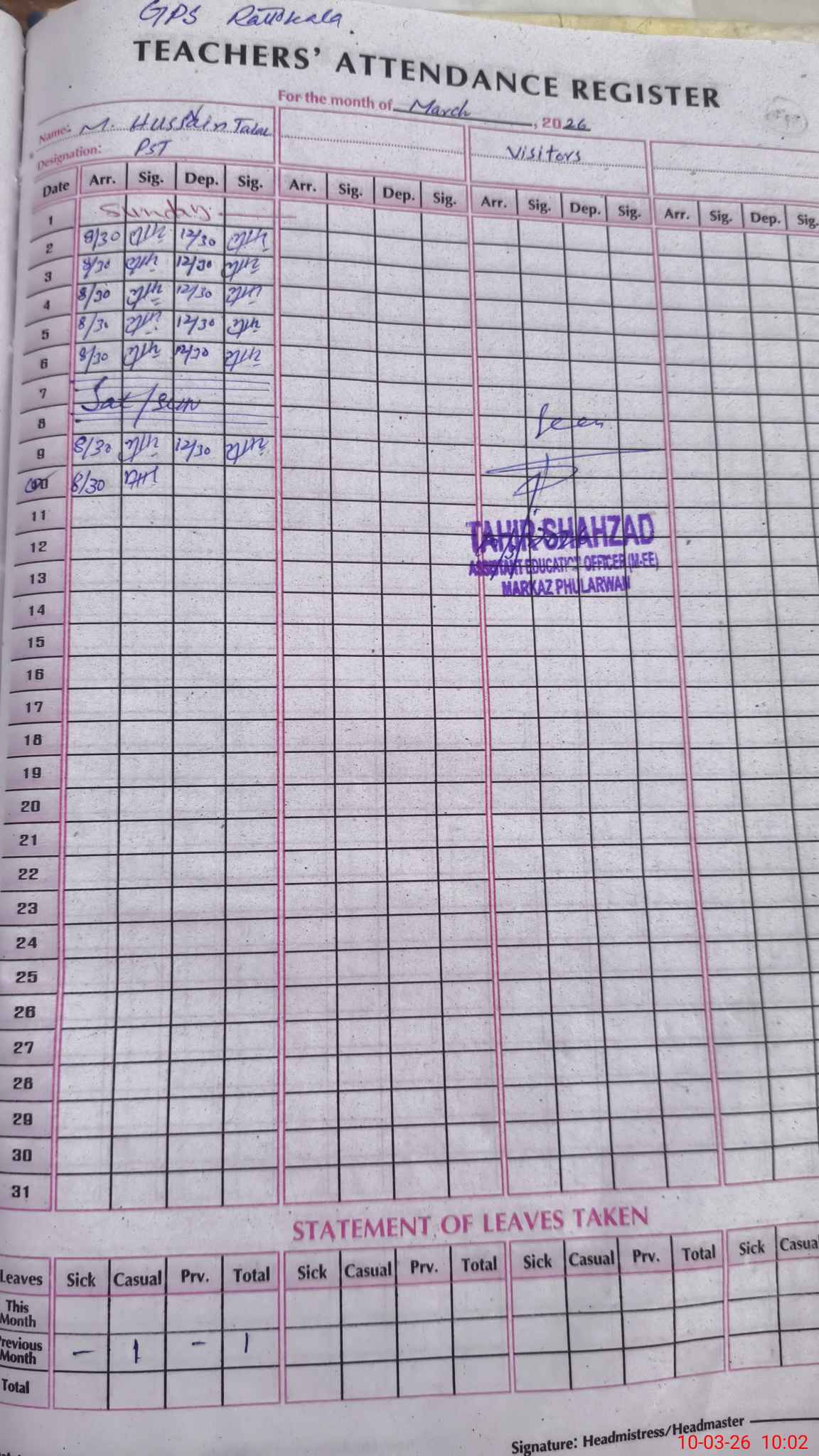 | Name: ZA**** IQ**** Designation: (School Headmaster's/Headmistress's) PST Phone/Cell Number: 03**** |