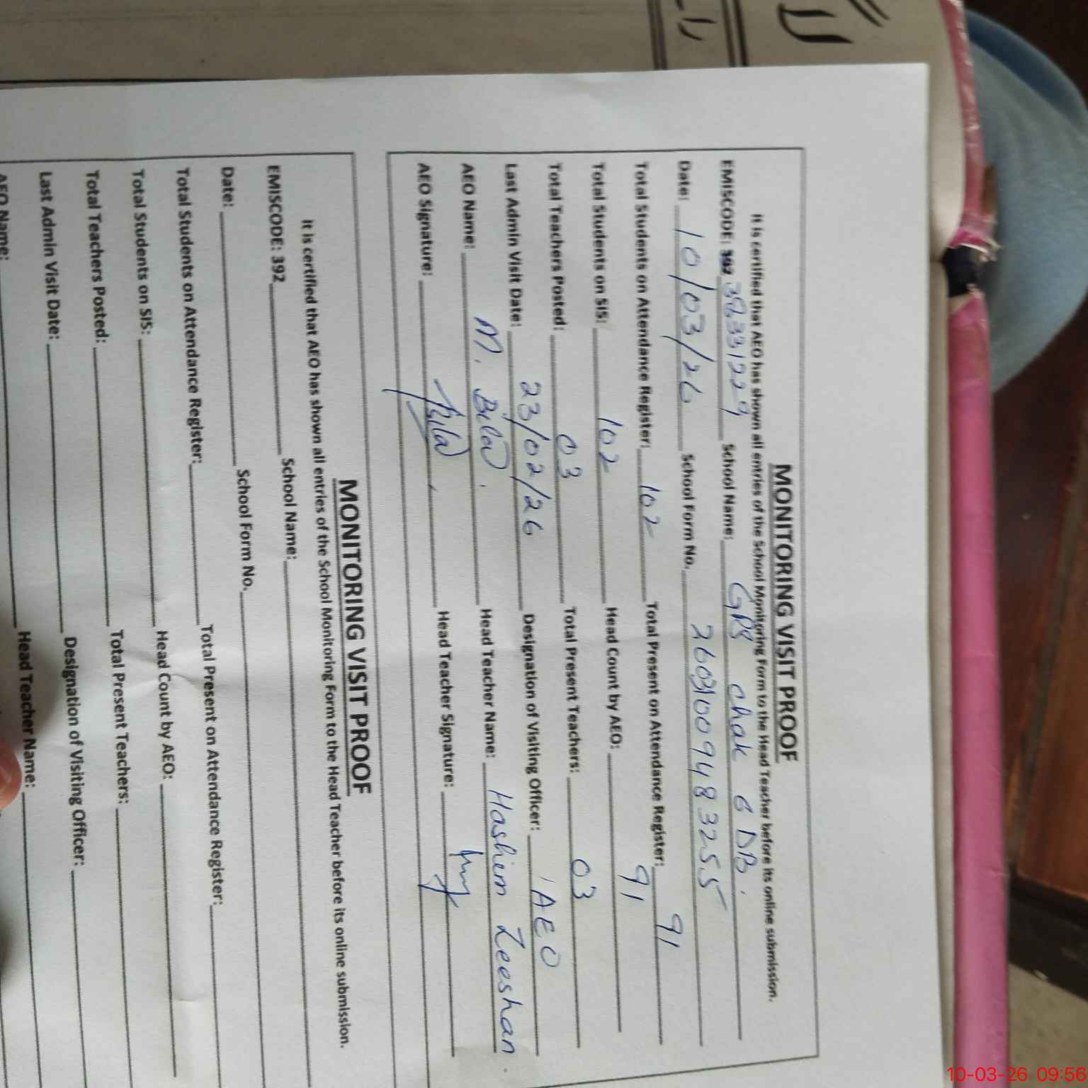 | Attendance Register | Head Teacher | MEA with School | Visit Proof |