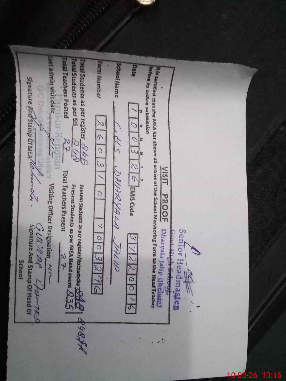 | Name: Gu**** Ah**** Designation: (School Headmaster's/Headmistress's) HEADMASTER Phone/Cell Number: 03**** |