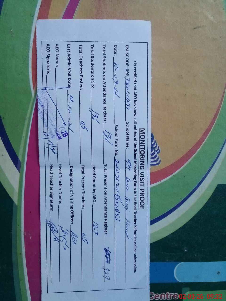 | Attendance Register | Head Teacher | MEA with School | Visit Proof |