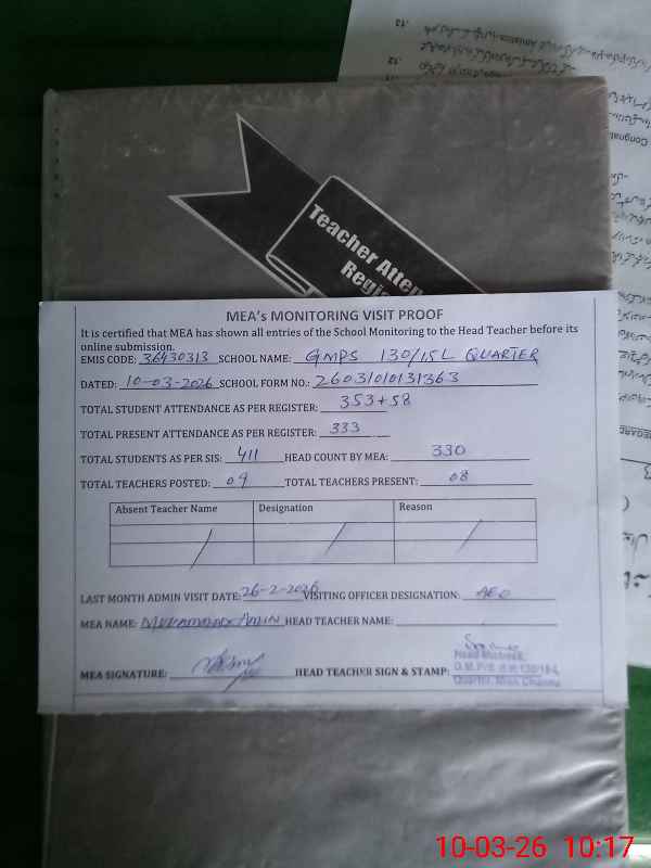 | EMIS Code: 36430313 | Name of School: GMPS 130/15-L QUARTER, MIAN CHANNU | |||