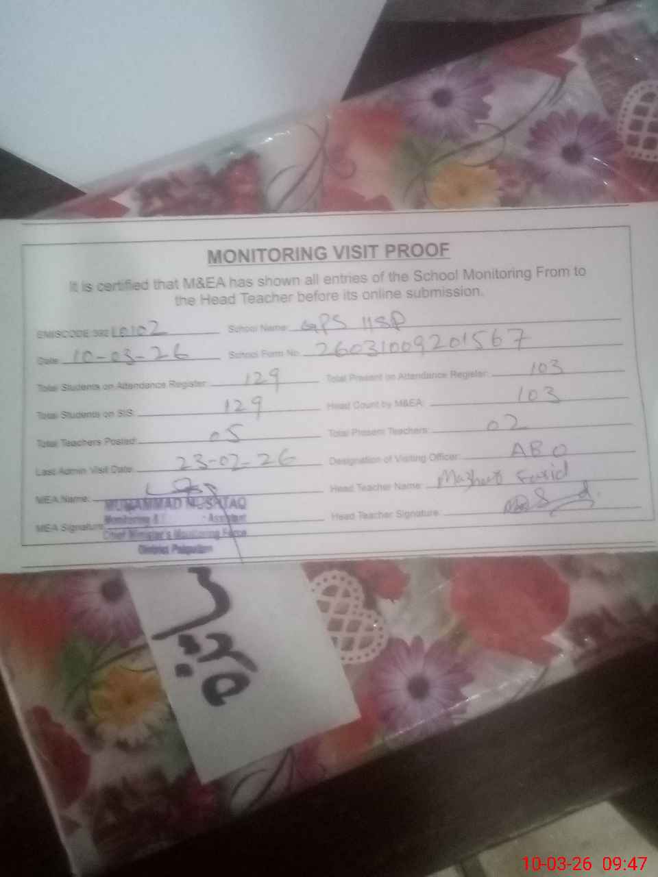 | Attendance Register | Head Teacher | MEA with School | Visit Proof |