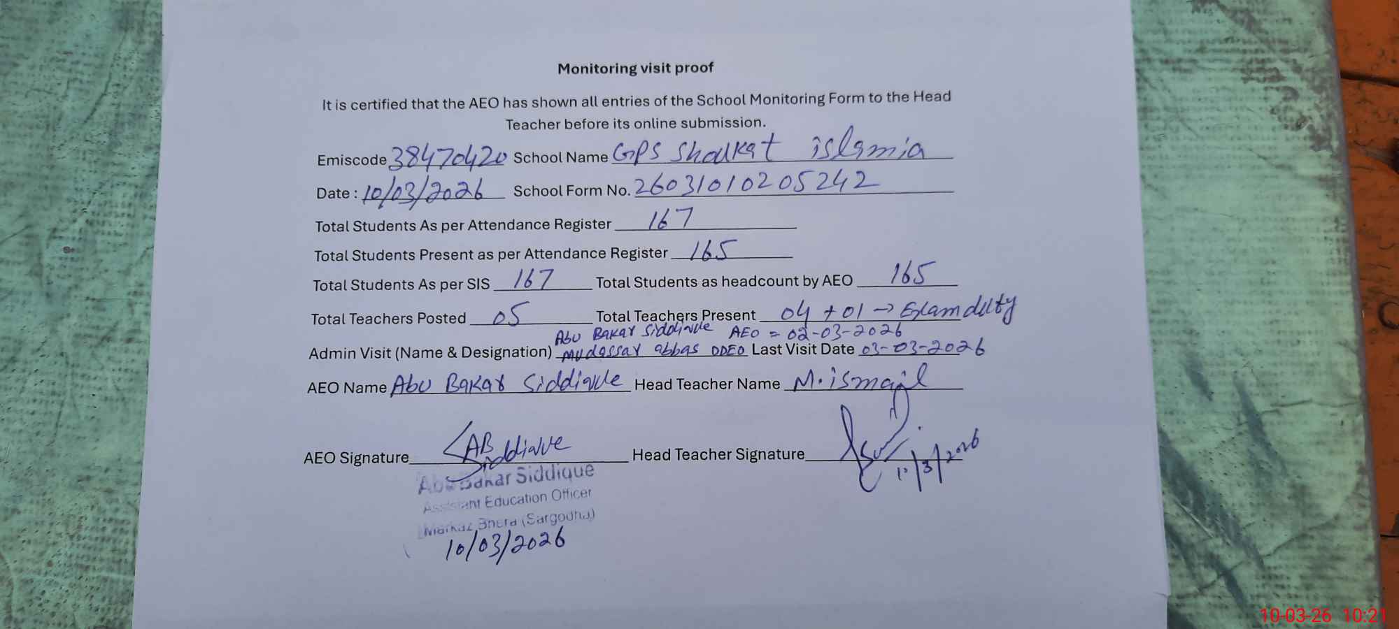 | Name: MU**** IS**** Designation: (School Headmaster's/Headmistress's) PST Phone/Cell Number: 03**** |