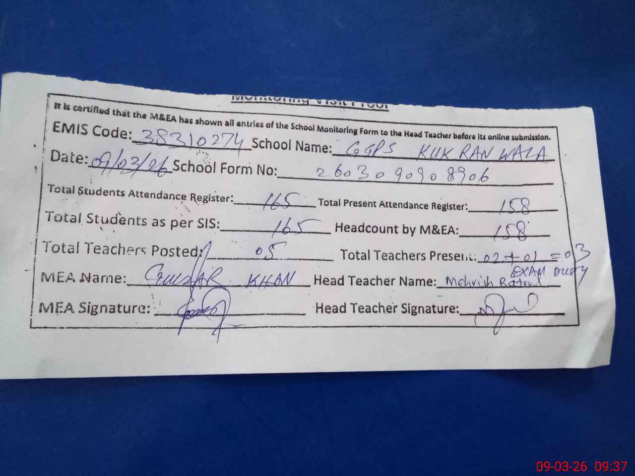 | Attendance Register | Head Teacher | MEA with School | Visit Proof |