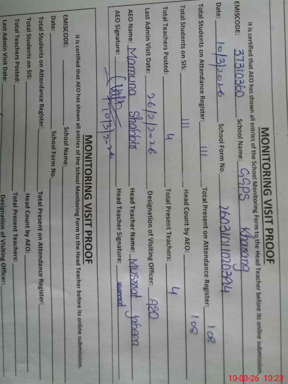 | Remarks (Use Separate Page if Required): School cleanliness was satisfactory. SBA is being conducted in school smoothly as per rountine | |||||