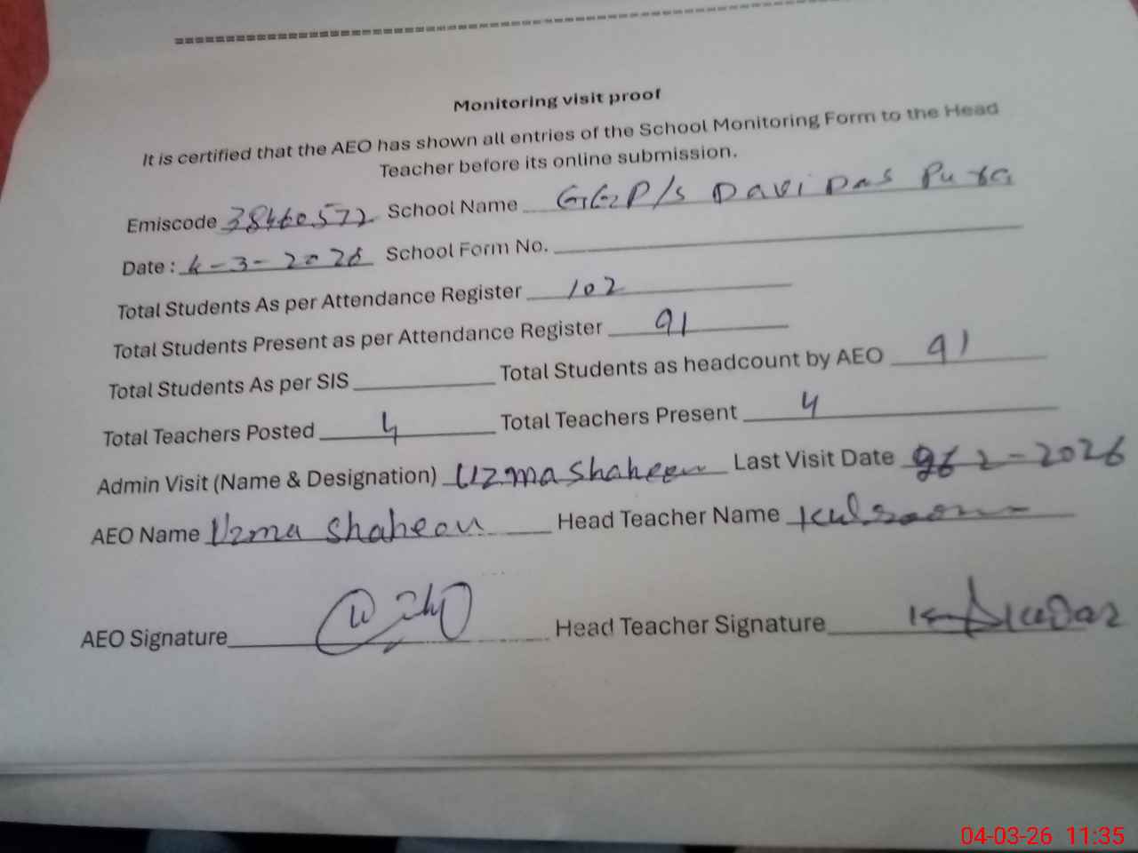 | Attendance Register | Head Teacher | MEA with School | Visit Proof |