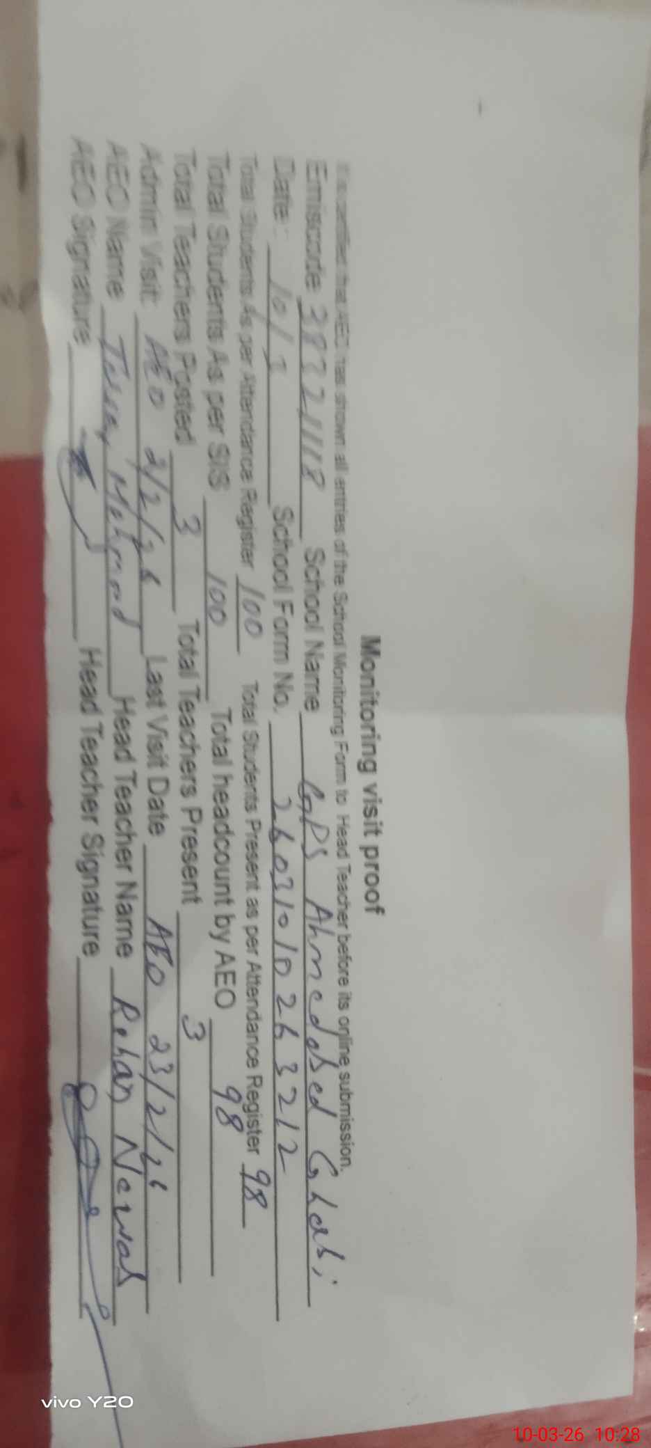 | Attendance Register | Head Teacher | MEA with School | Visit Proof |