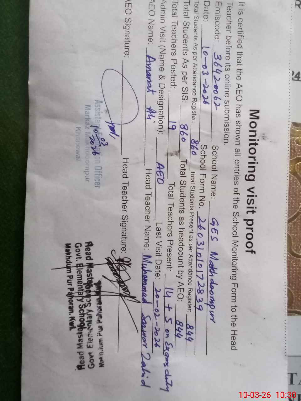 | EMIS Code: 36420062 | Name of School: GES MAKHDOOM PUR, KHANEWAL | |||