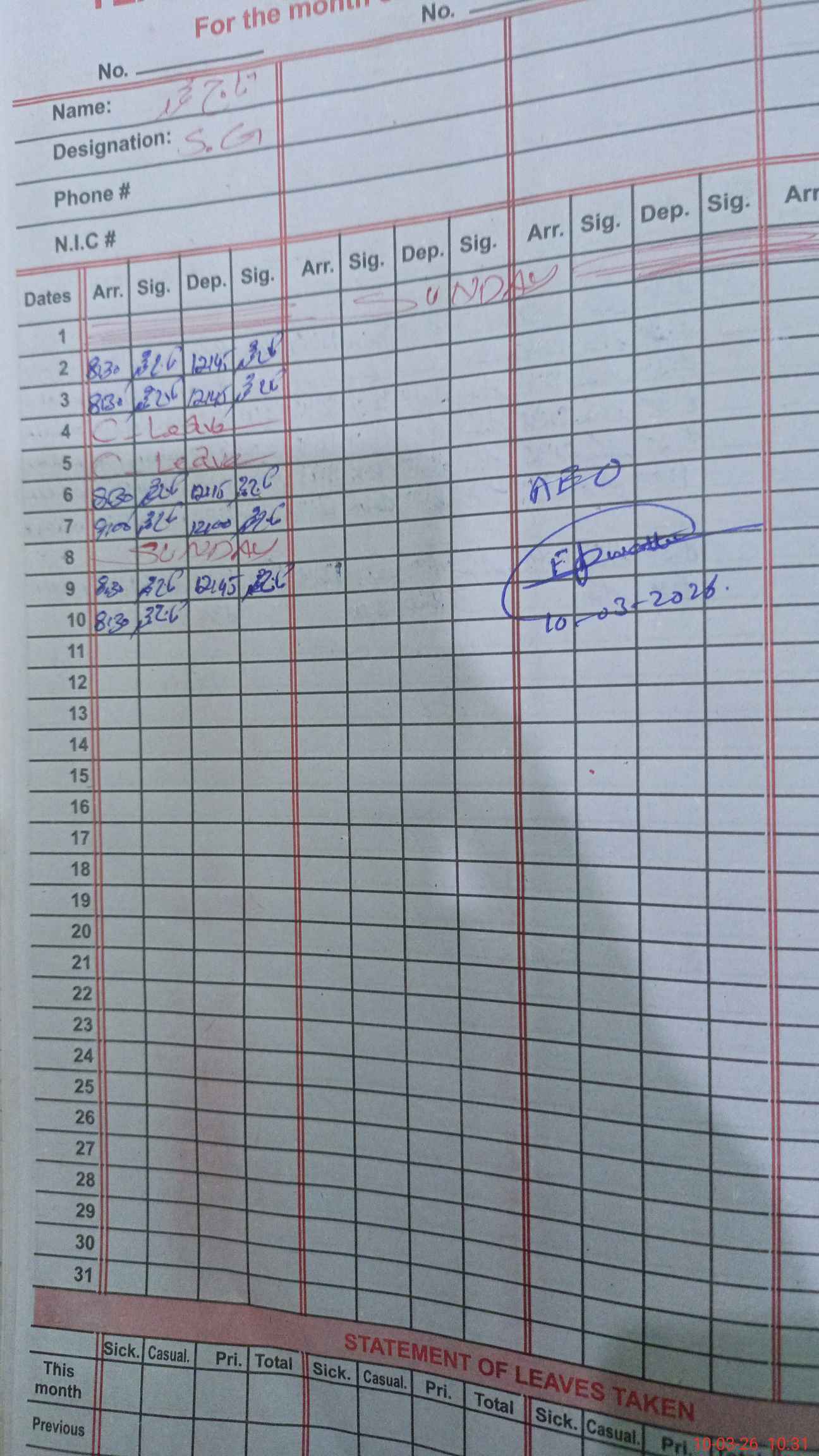 | CNIC | Full Name | Designation | R/C | Absence During Last Calender Month |