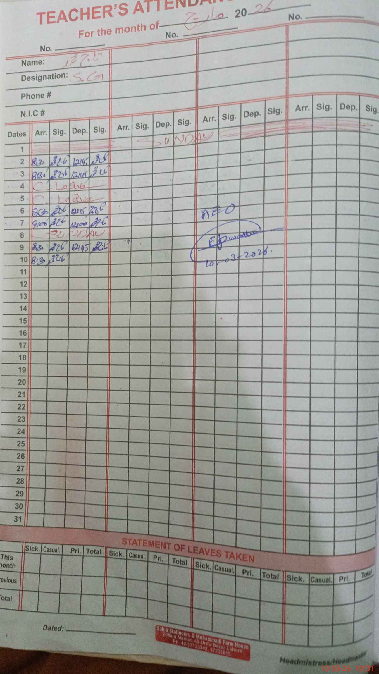 | Name: Sa**** Am**** Designation: (School Headmaster's/Headmistress's) SST GENERAL Phone/Cell Number: 03**** |