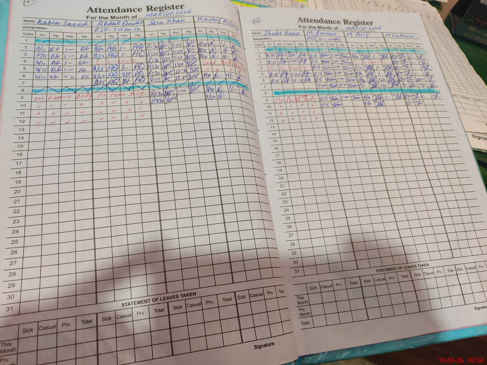 | 36**** | Ab**** Qa**** | EST Science | Regular | 0 | 0 | 0 | 0 | 0 | 0 | 0 | 0 | 0 | Exam Duty |
