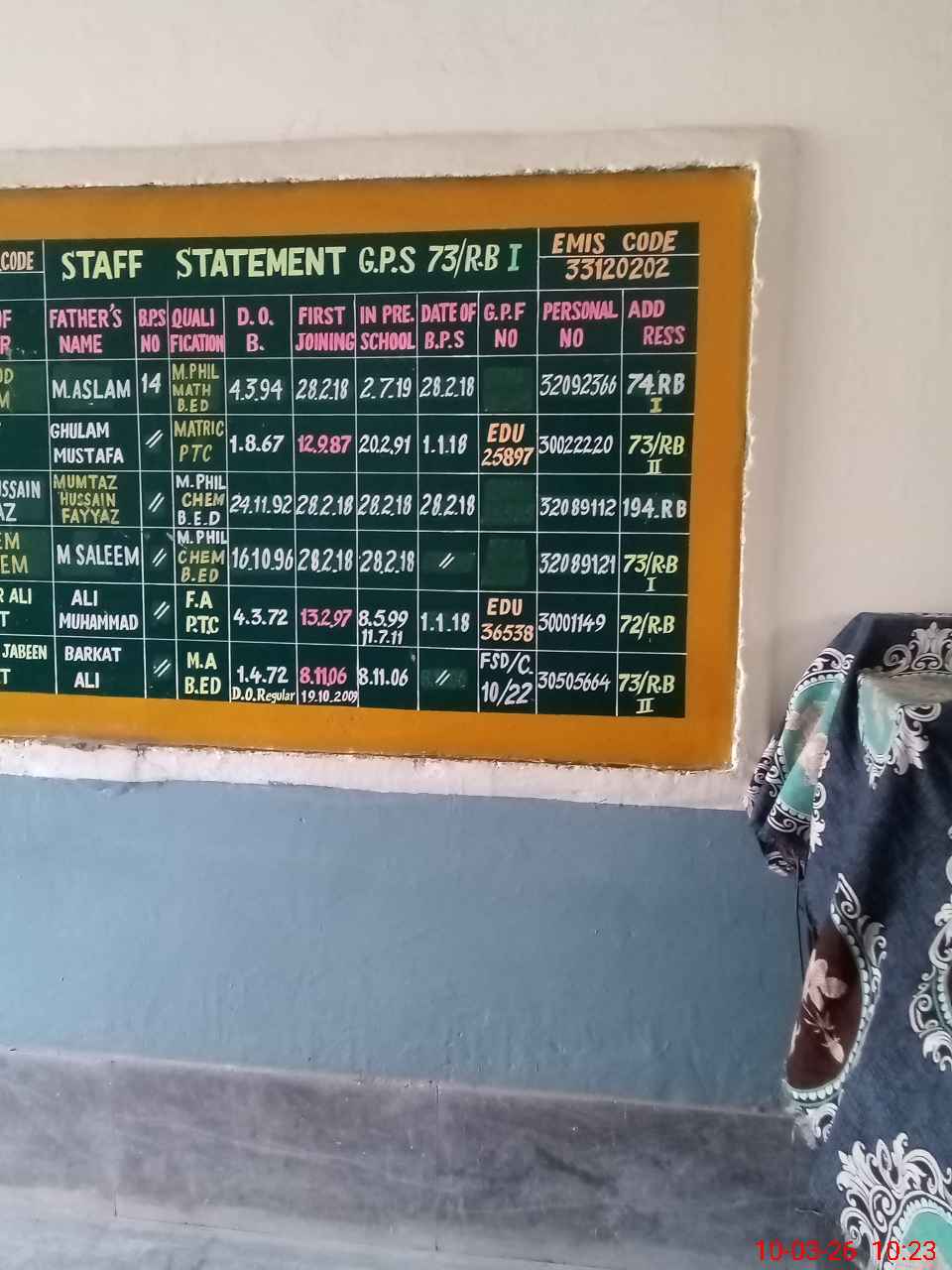 | EMIS Code: 33120202 | Name of School: GPS CHAK 73 RB I | |||