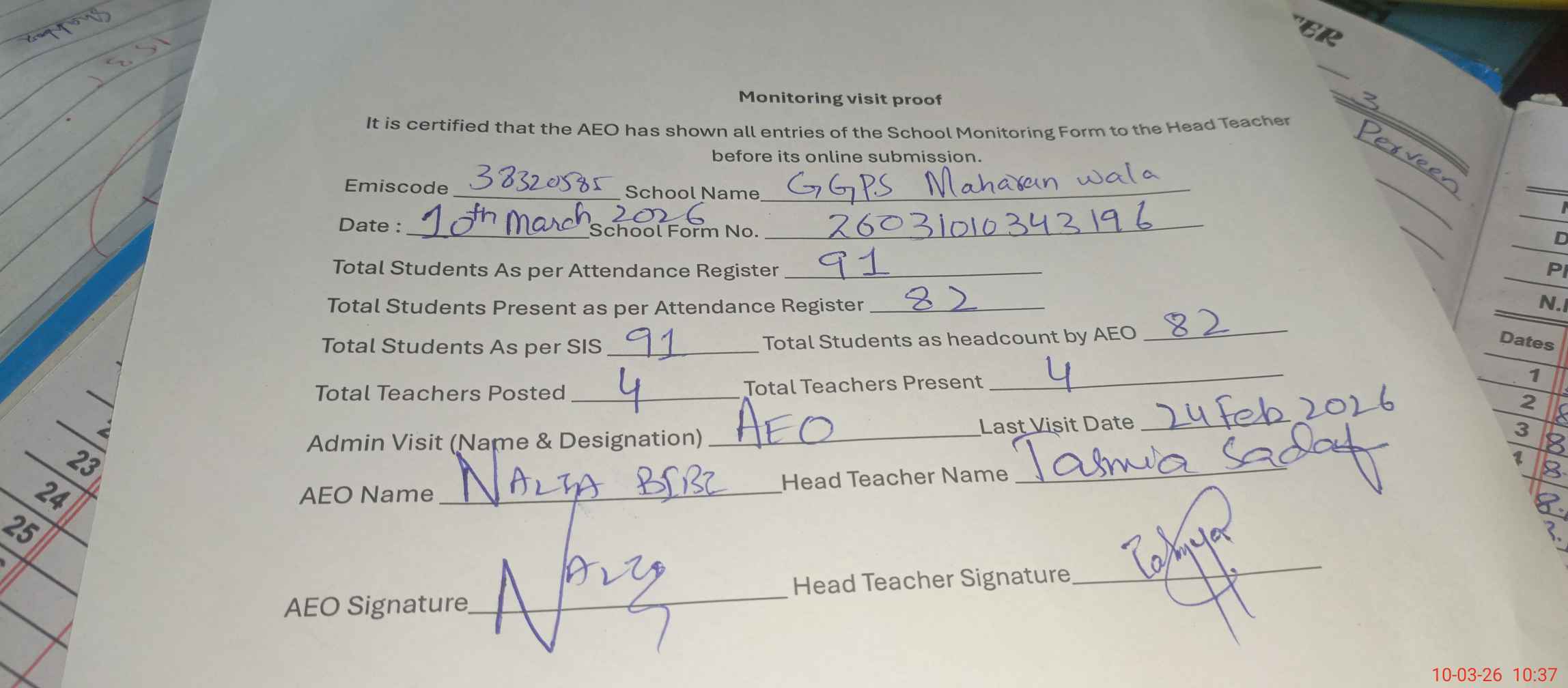 | Attendance Register | Head Teacher | MEA with School | Visit Proof |