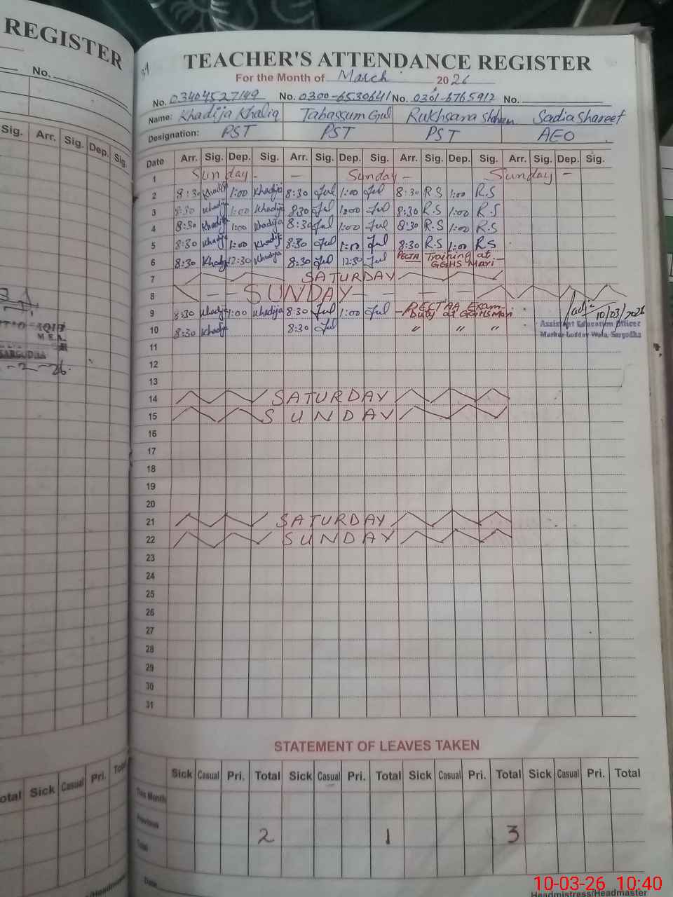 | Name: Kh**** Kh**** Designation: (School Headmaster's/Headmistress's) PST Phone/Cell Number: 03**** |