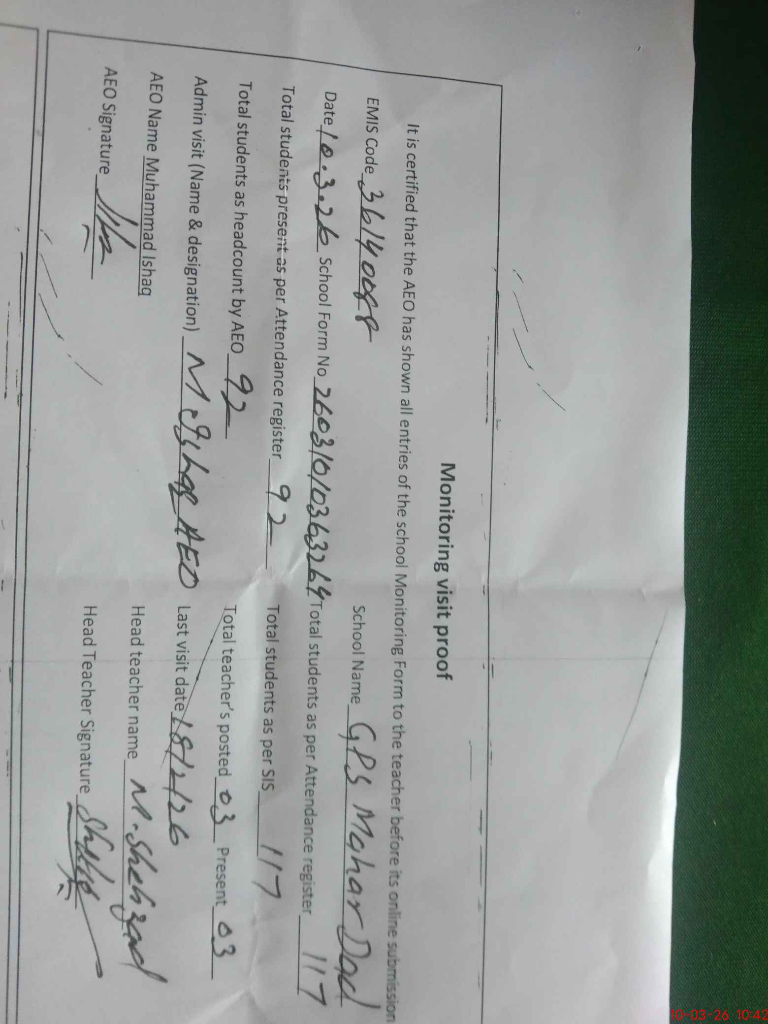 | Certified that this School was Inspected by the Undersigned MEA/DMO Today and the Information Stated Above is as Per Record. | |||||