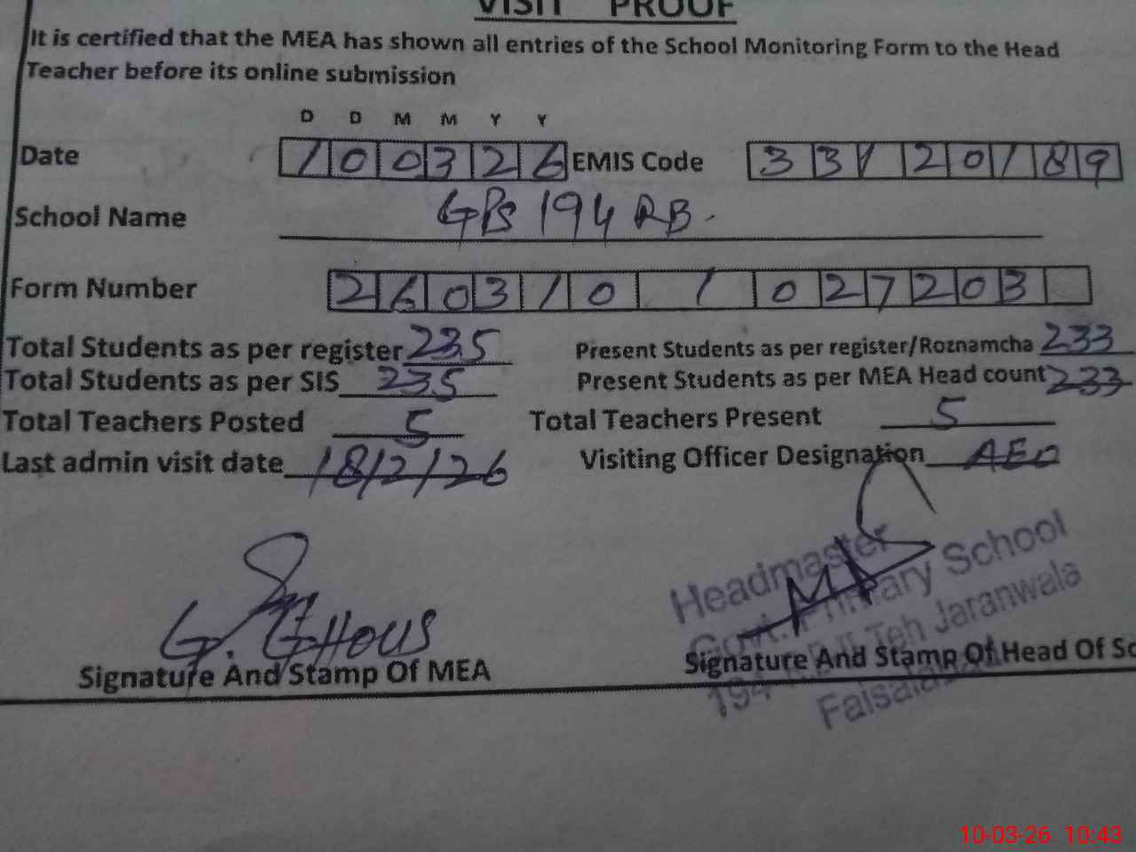 | Certified that this School was Inspected by the Undersigned MEA/DMO Today and the Information Stated Above is as Per Record. | |||||