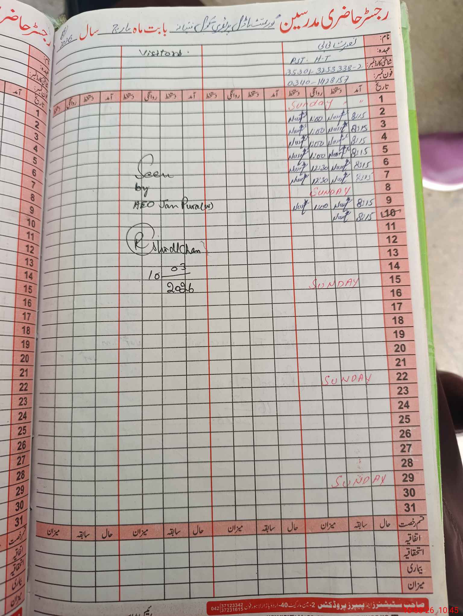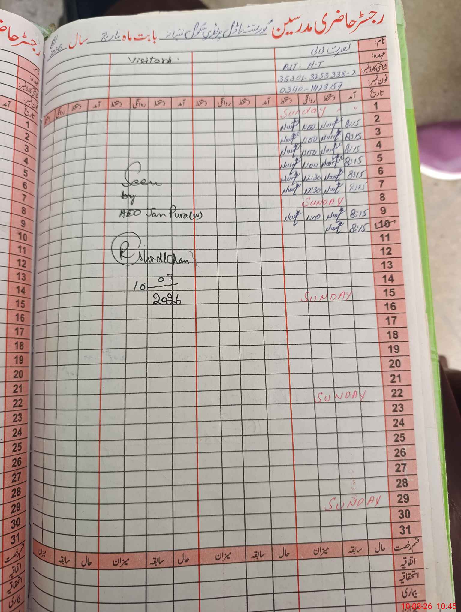 | Name: Nu**** Bi**** Designation: (School Headmaster's/Headmistress's) PST Phone/Cell Number: 03**** |