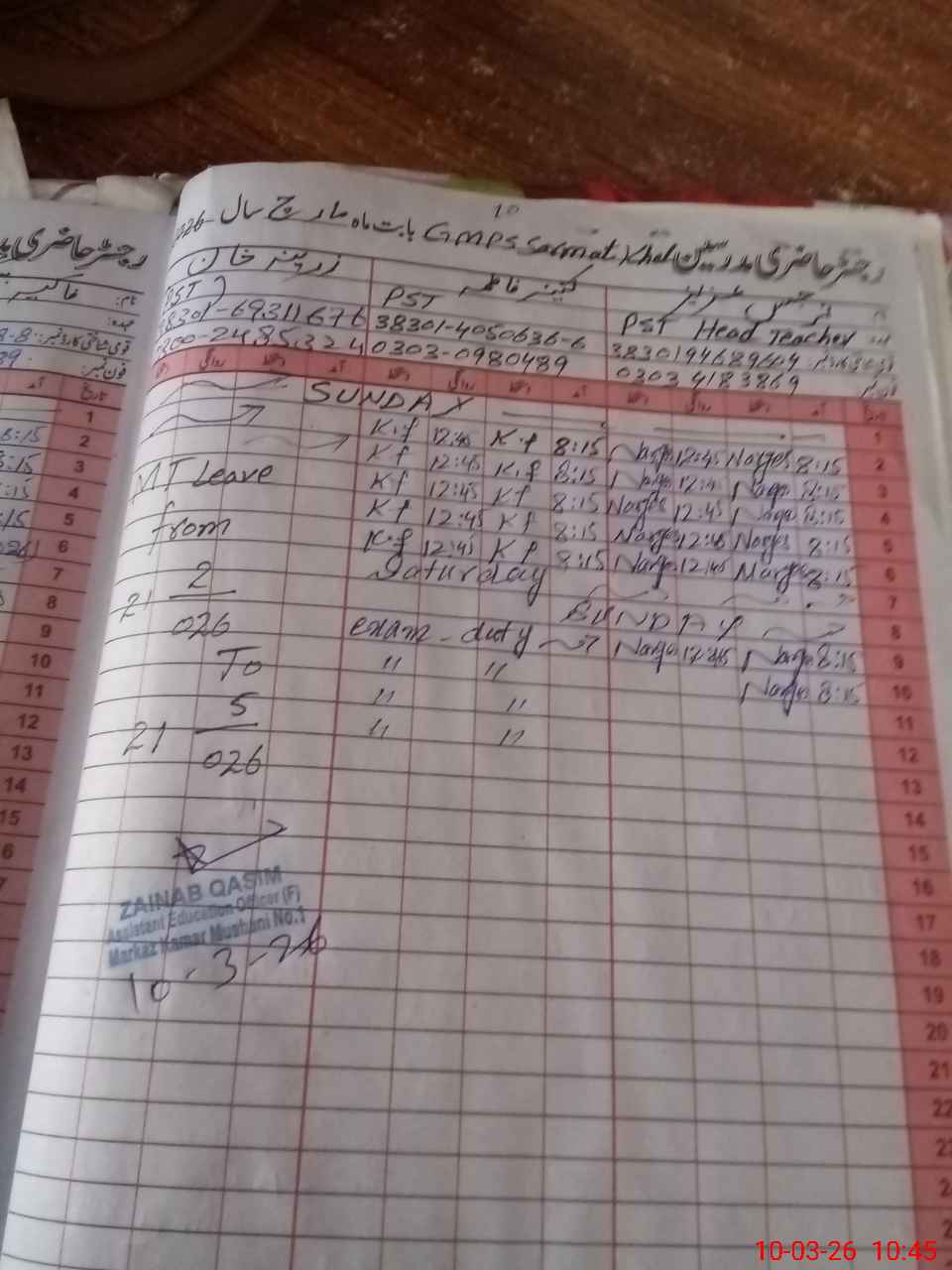 | 38**** | Za**** Kh**** | PST Science/Maths | Regular | 0 | 0 | 0 | 0 | 0 | 0 | 0 | 0 | 0 | Maternity |