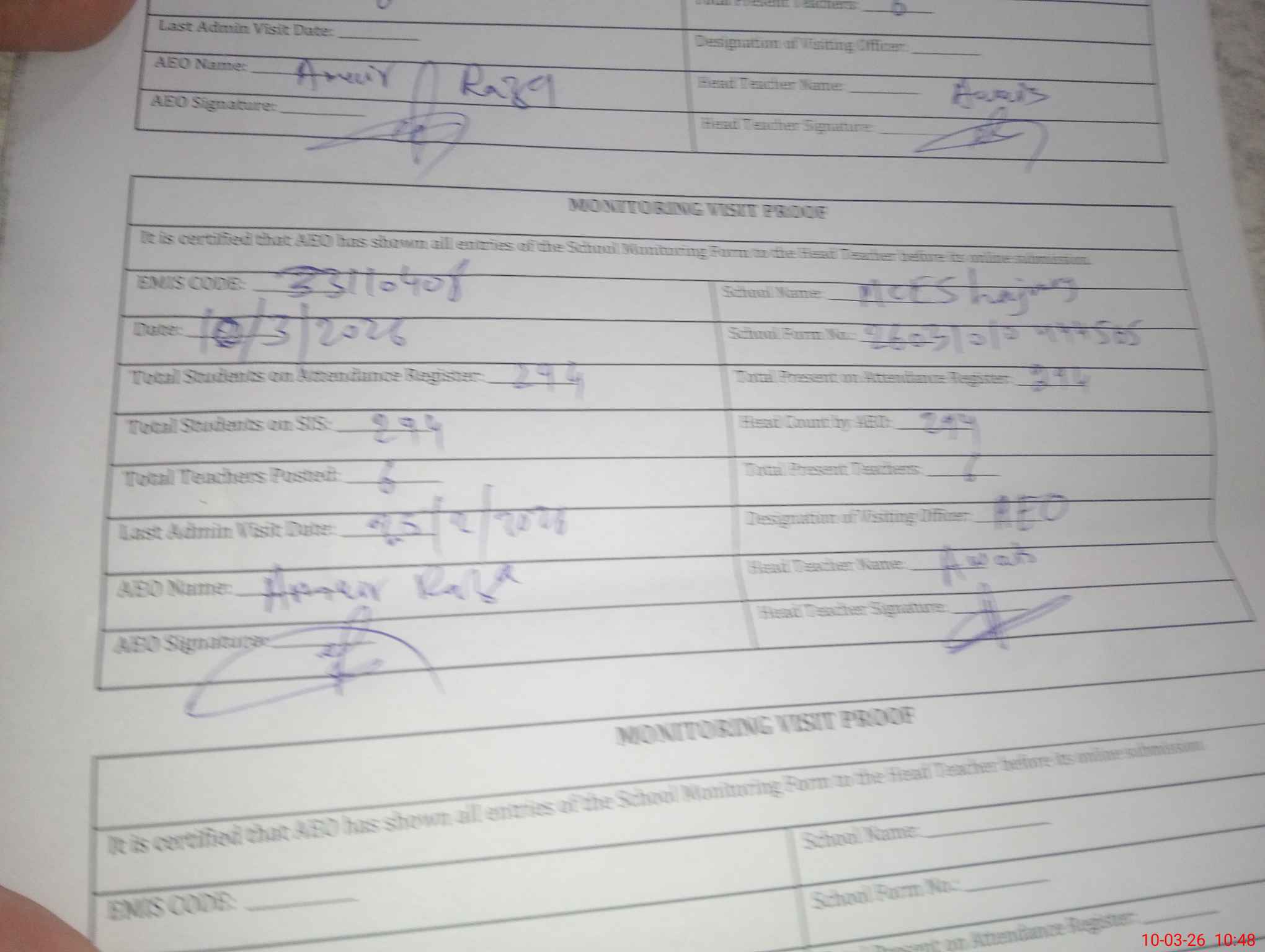 | Certified that this School was Inspected by the Undersigned MEA/DMO Today and the Information Stated Above is as Per Record. | |||||