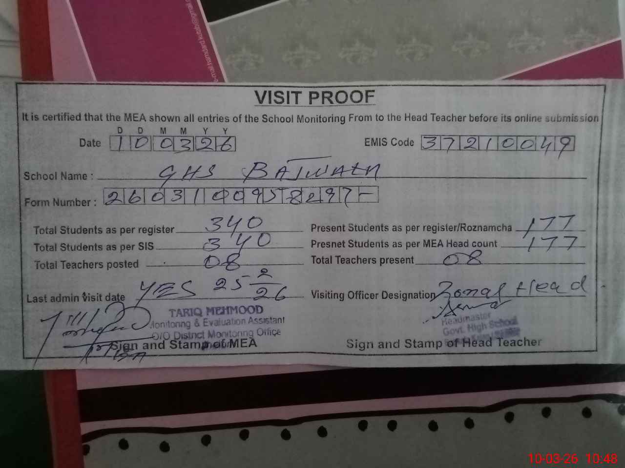 | Certified that this School was Inspected by the Undersigned MEA/DMO Today and the Information Stated Above is as Per Record. | |||||