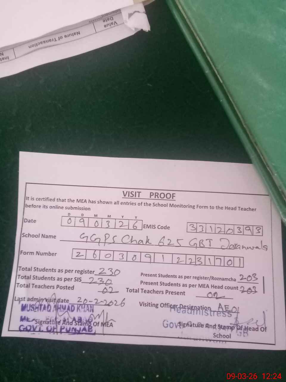 | Attendance Register | Head Teacher | MEA with School | Visit Proof |
