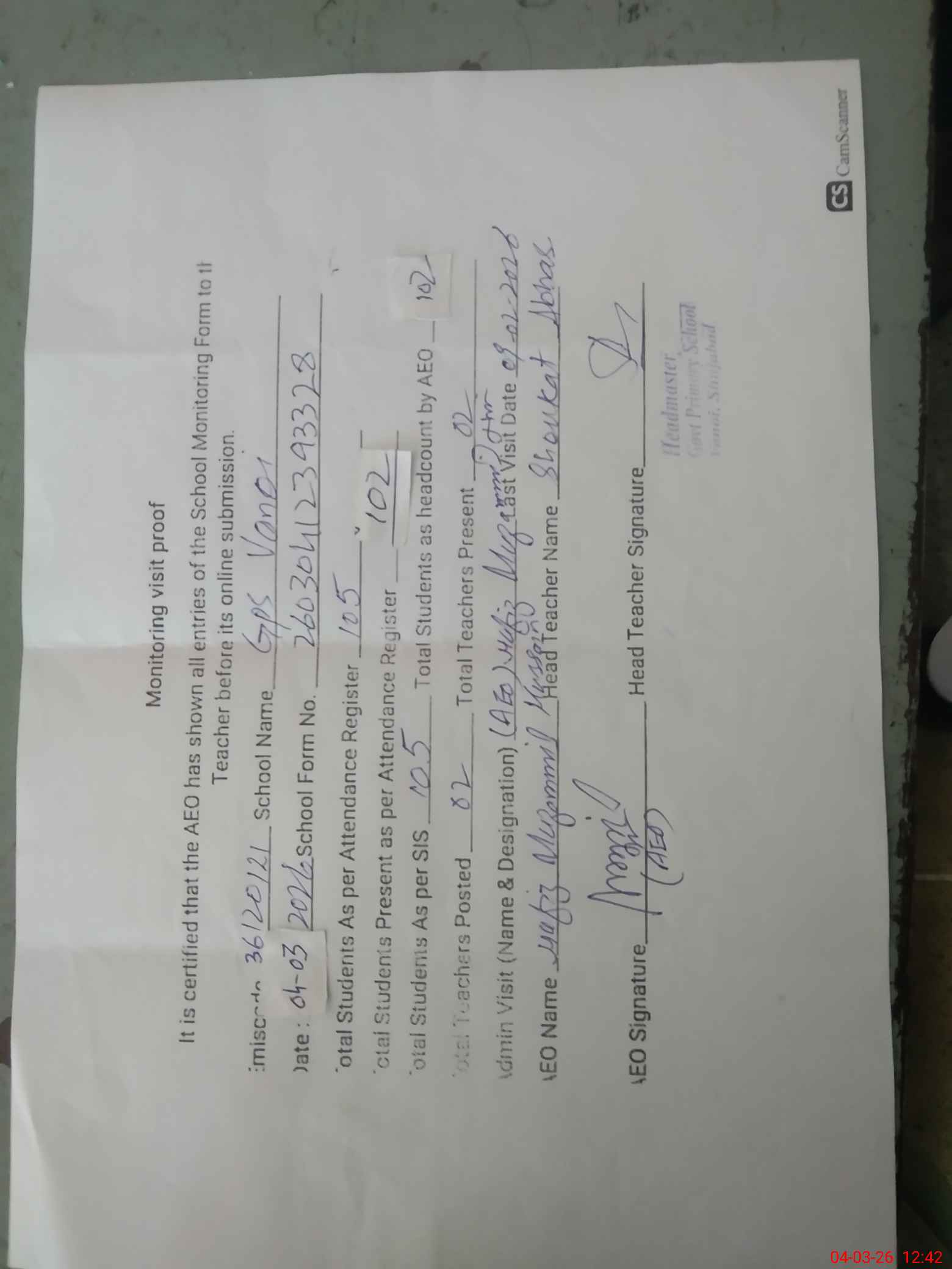 | Attendance Register | Head Teacher | MEA with School | Visit Proof |