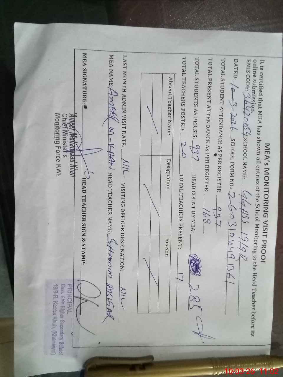 | Attendance Register | Head Teacher | MEA with School | Visit Proof |