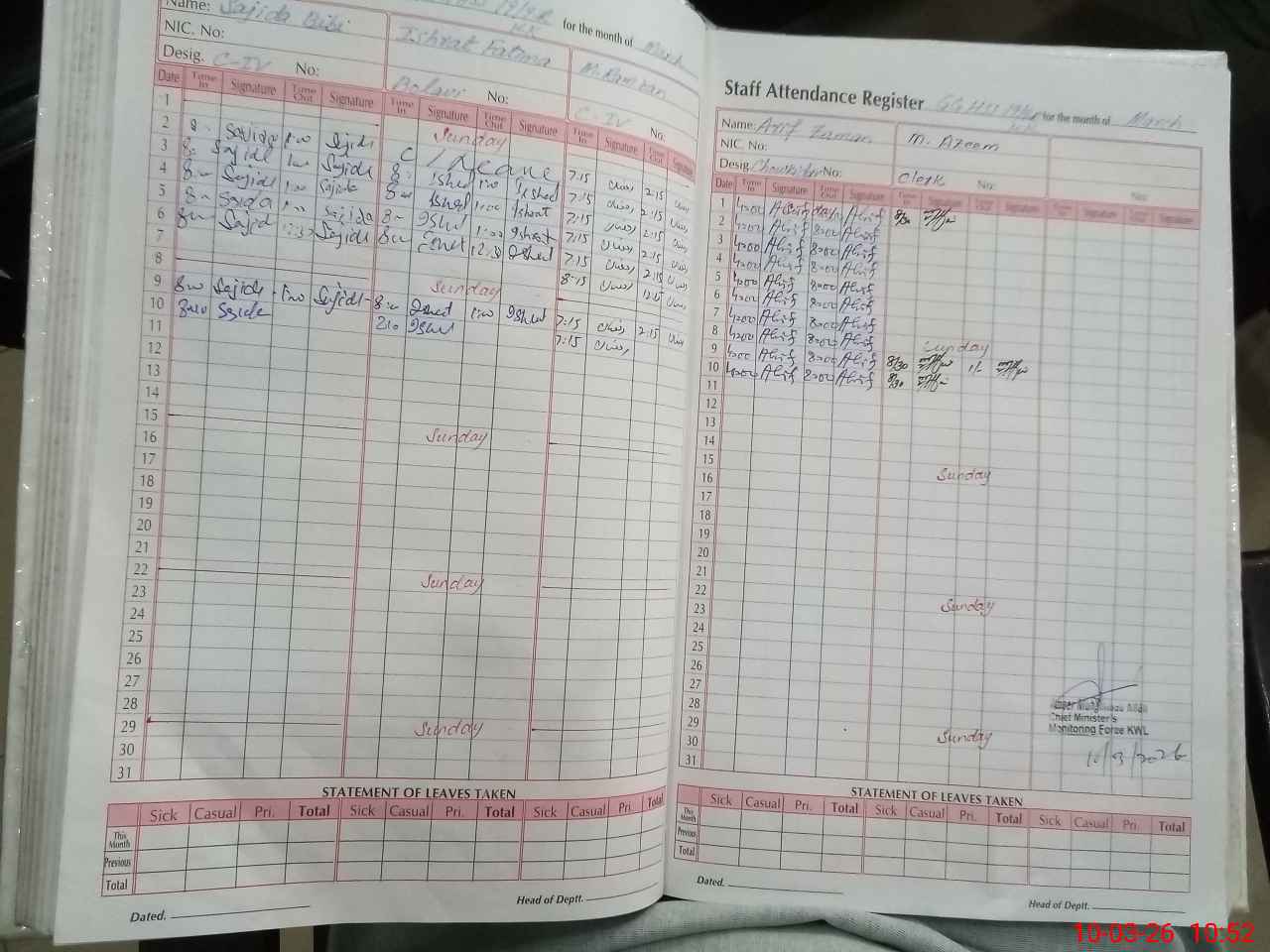 | CNIC | Full Name | Designation | R/C | Absence During Last Calender Month |