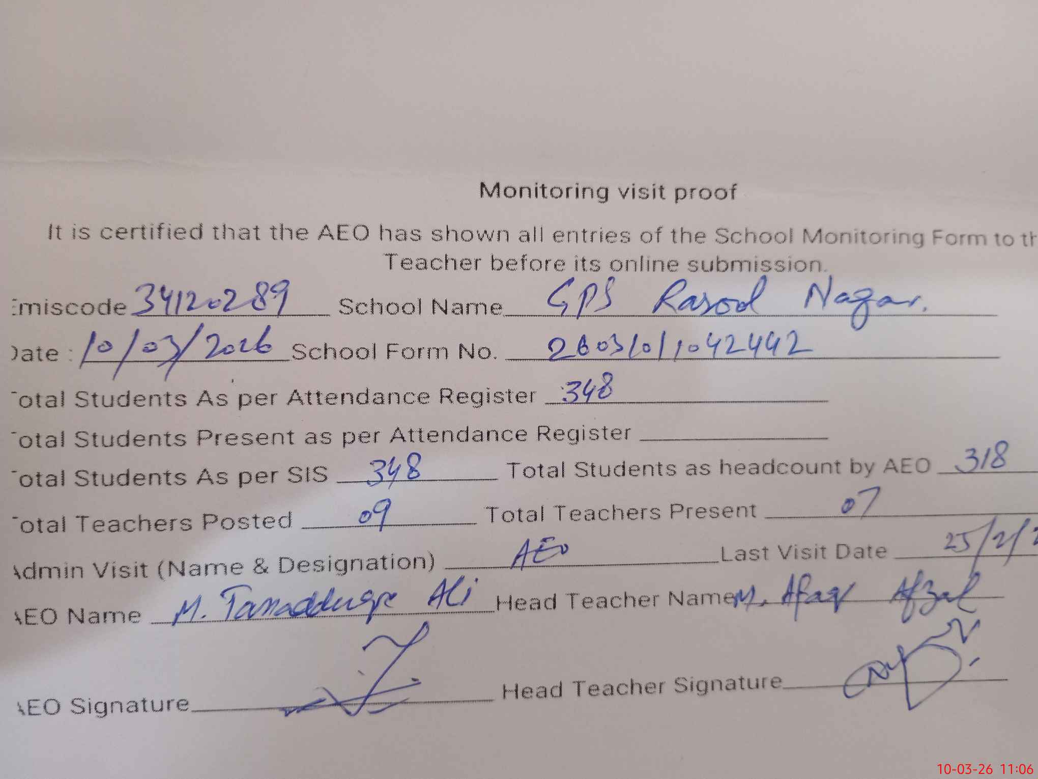 | Attendance Register | Head Teacher | MEA with School | Visit Proof |